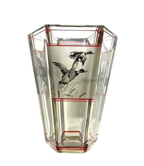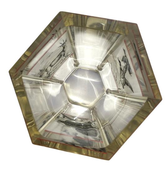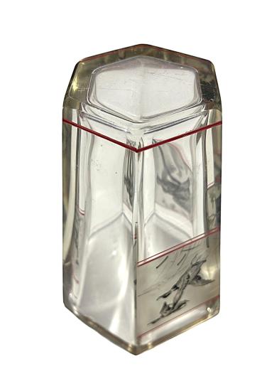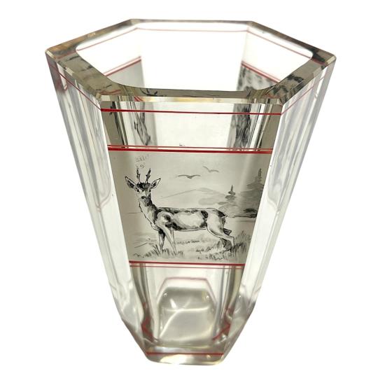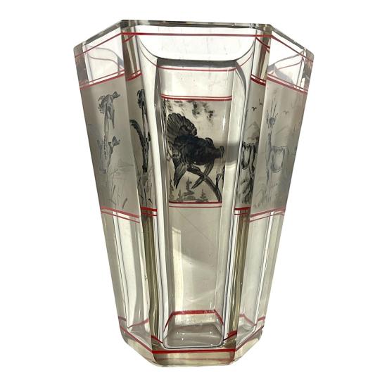 Skleněný silnostěnný starožitný pohárek s loveckou tematikou. Ručně malované motivy na zmatněném povrchu s červenými detaily. Na výšku měří 14,5 cm. Průměr hrdla je 10 cm, průměr podstavy 6 cm. Ošoupaná podstava a setřené původní nápisy jinak bez poškození. Neznačeno.