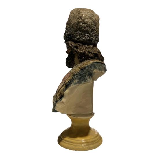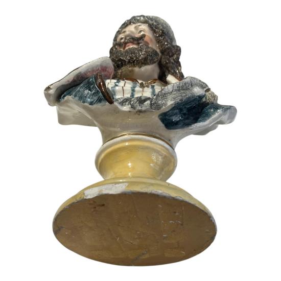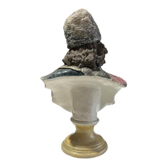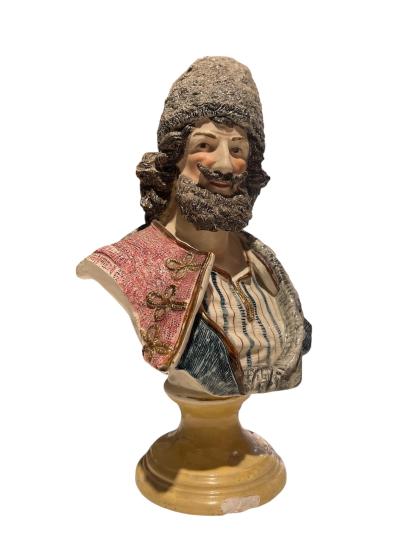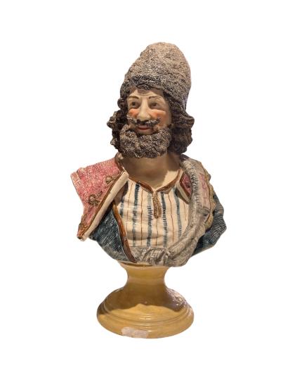 Starožitná busta muže s plnovousem a čepicí v orientálním barevném oděvu. Na výšku měří 37 cm, v nejširším bodě měří 21 cm. Hloubka je 13 cm/ dle podstavy. Busta je detailně propracovaná a precizně dekorovaná. Na vnější hraně podstavce se nachází z přední strany poškození, viz foto. Jinak v dobrém stavu. Neznačeno.