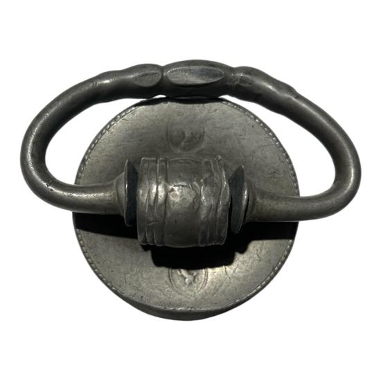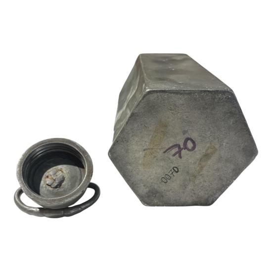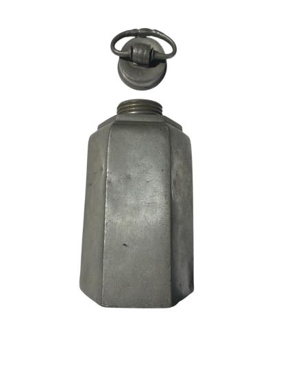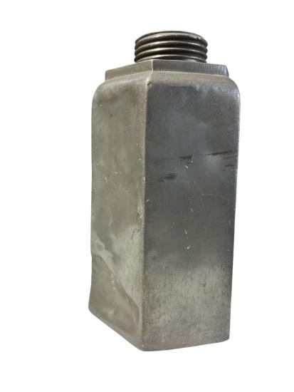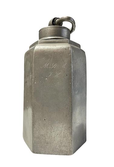 Starožitná cínová nádoba na vodu se šroubovacím uzávěrem. Na výšku měří 27 cm i s úchytem uzávěru, průměr hrdla je 4,5 cm, Průměr podstavy 11 cm. Ze přední strany se na nádobě nachází vyrytý monogram/nápis. Z boční strany je patrná deformace materiálu a promáčkliny. Na lahvi a na podstavě se nachází několik škrábanců. Značeno ze spodní strany dole viz foto a z vrchní strany uzávěru.