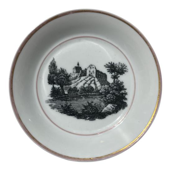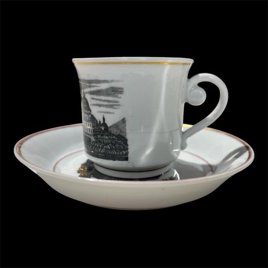 Starožitný šálek s podšálkem s malbou Kláštera v Klosterneuburgu a se zlatým lemováním. Značka Lippert & Haas in Schlaggenwald- Horní Slavkov, období 1830- 1847. Šálek měří na výšku 7 cm. Průměr hrdla 7 cm, šířka i s uchem je 9,5 cm. Průměr podšálku je 13,5 cm, na výšku měří 2,5 cm. Značeno ze spodní strany dole viz foto. V perfektním stavu bez poškození, pouze zlacení je místy ošoupané.