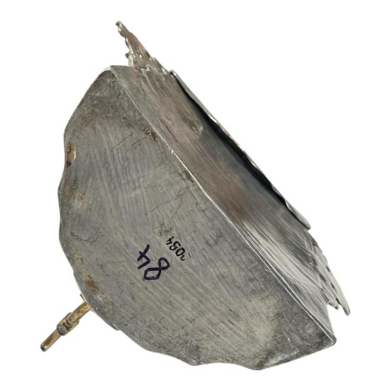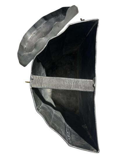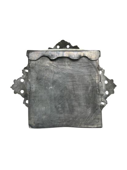 Starožitná cínová nádrž na vodu s mosazným kohoutkem. Zdobená rytinou a nápisem v přední části. Nádrž je opatřena víkem a ozdobnými úchyty k připevnění. Celková výška i s víkem je 31 cm. V nejširším bodě měří 33,5 cm. Hloubka je i s kohoutkem 19 cm. Stav odpovídá stáří. Neznačeno.