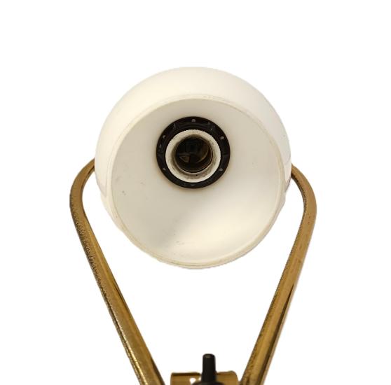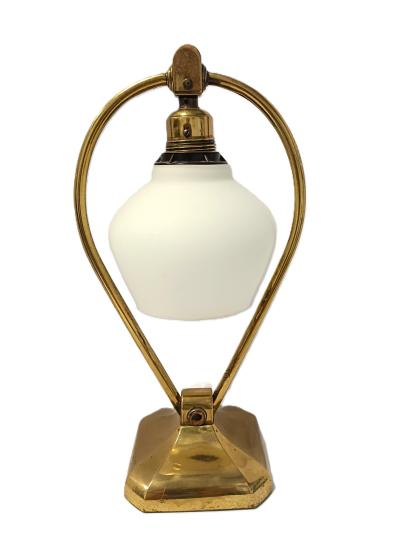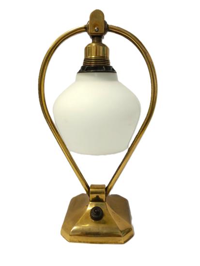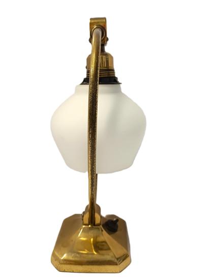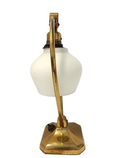 Starožitná mosazná polohovací lampička se skleněným stínítkem. Nutná nová elektroinstalace. Rozměry: 31 x 16 cm na podstavci o průměru 11,5cm.