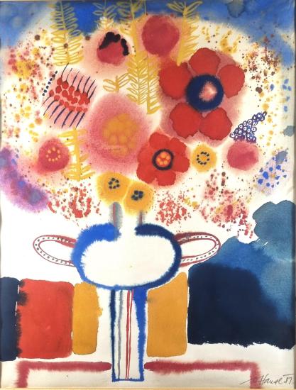 Dílo od výtvarníka Oldřicha Hanzla. Neotřelým způsobem vytváří pohled na zátiší, hojně využívá rozpitého efektu, díky kterému vznikají organicky vypadající plochy a tvary, které ohraničuje, usměrňujě či dopňuje o detaily. Obraz hraje teplými barvami a působí harmonicky. Akvarel na papíře, rámováno pod sklem, rozměry s rámem 71 x 85 cm, rozměry díla 59 x 45 cm. Signováno vpravo dole "O. Hanzl 87".
