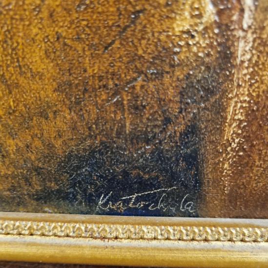 Drobné dílo s námětem figury, která drží růži. Malba je silně strukturální, umělec vytváří hrubou strukturou základní obrysy a tvary, které dobarvuje a halí do zemitých tónů. Rudá růže vyniká z celého díla nejvíce, dílo nese nostalgickouatmosféru. Kombinovaná technika na plátně, rámováno, rozměry s rámem 42 x 31 cm, rozměry díla 36 x 25 cm. Signováno vpravo dole "Kratochvíla".