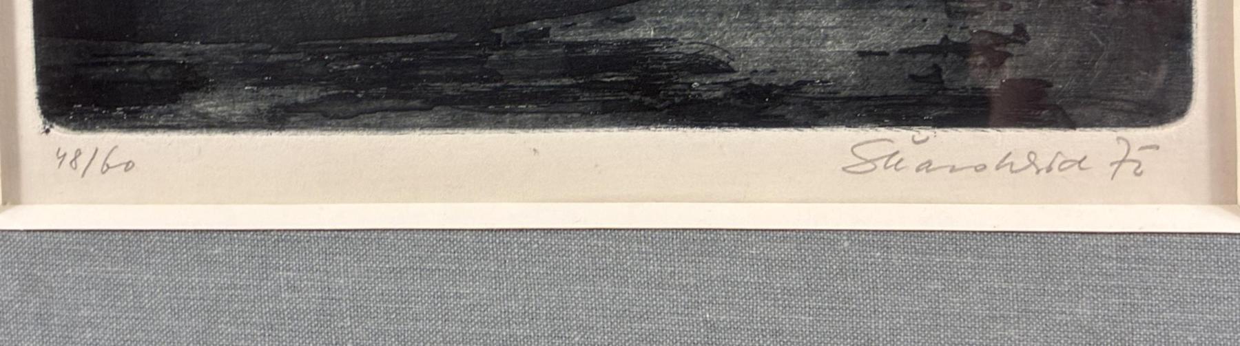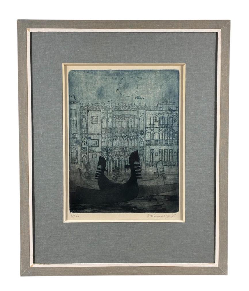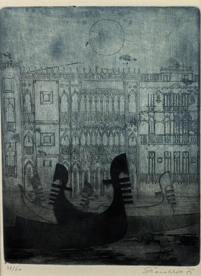 Příjemná grafika s benátským motivem od výtvarníka Škarohlída. Umělec vytváří potemnělý výjev Benátek s gondolami, padla noc a loďky zahalila tma. Architekturu naznačuje v jemných linkách v pozadí a nad celou scénou visí měsíc. Umělec příjemně vyvažuje obraz, místy vytváří prokreslené plochy, jinde zůstává u jednotlivých linek. Grafika na papíře, paspartováno pod sklem, rozměry s paspartou 39 x 32 cm, rozměry díla 22 x 17 cm. Signováno vpravo dole "Škarohlíd 75", výtisk 48/60.