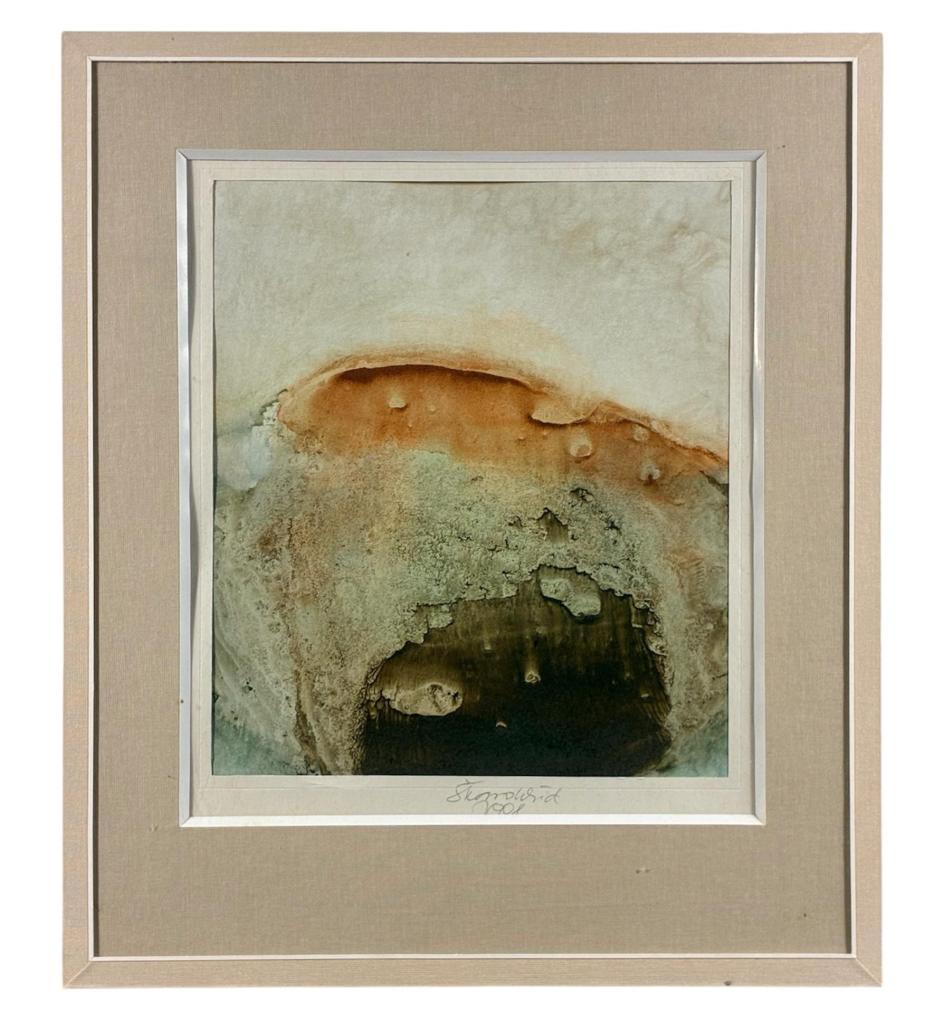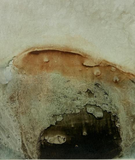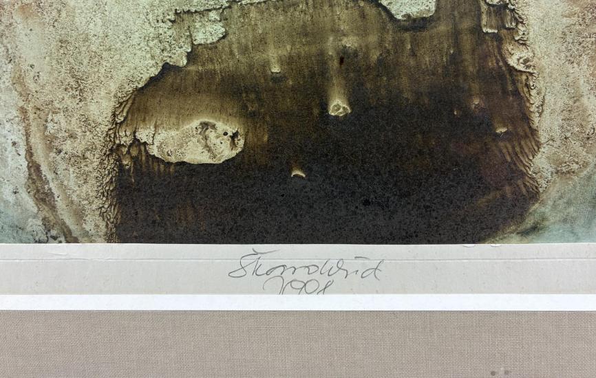 Abstraktní dílo od výtvarníka Škarohlída. Umělec v tomto obraze pracuje s efektem obtisklé barvy, který vytváří velmi specifickou stopu či dalo by se říct kresbu, vznikají organicky působící plochy s žíháním, které připomíná kořeny, či žíly. Dílo je tvořeno tímto procesem, autor zasahuje štětcem jen ve vrchní části obrazu. Dekalk na papíře, paspartováno pod sklem, rozměry s paspartou 42 x 36 cm, rozměry díla 26 x 22 cm. Signováno dole uprostřed "Škarohlíd 1998". Ze zadní strany autorský štítek "Jaroslav Škarohlíd, Krajiny pana Dalího, orig. dekalk, 1998".