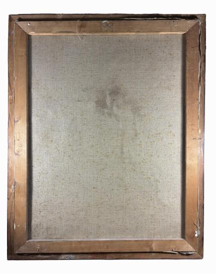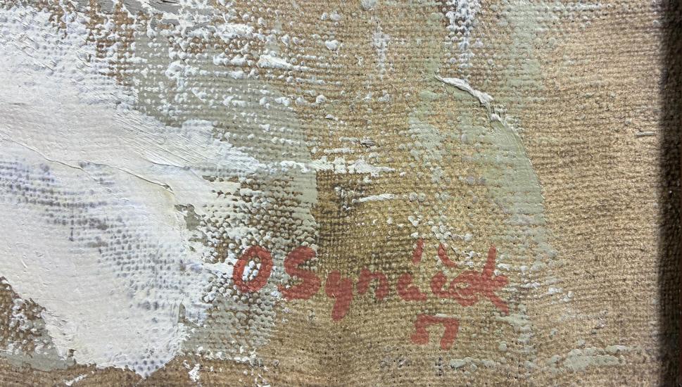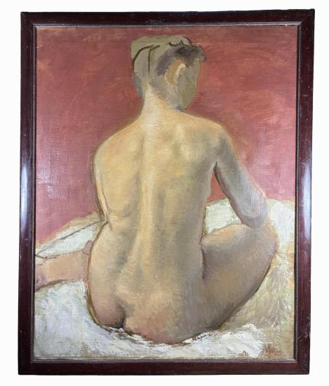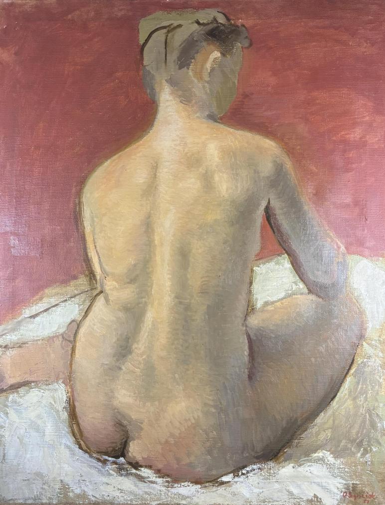 Velkoformátová malba od Otakara Synáčka s námětem aktu zezadu. Dílo působí jako studijní malba, model sedí zády a tak umělec věnuje veškerou pozornost hmotě svalů na zádech, záhybům a křivkám. Postava je v obklopení červeného pozadí. Olej na plátně, rámováno, rozměry s rámem 100 x 80 cm, rozměry díla 72 x 92 cm. Signováno vpravo dole "O. Synáček".