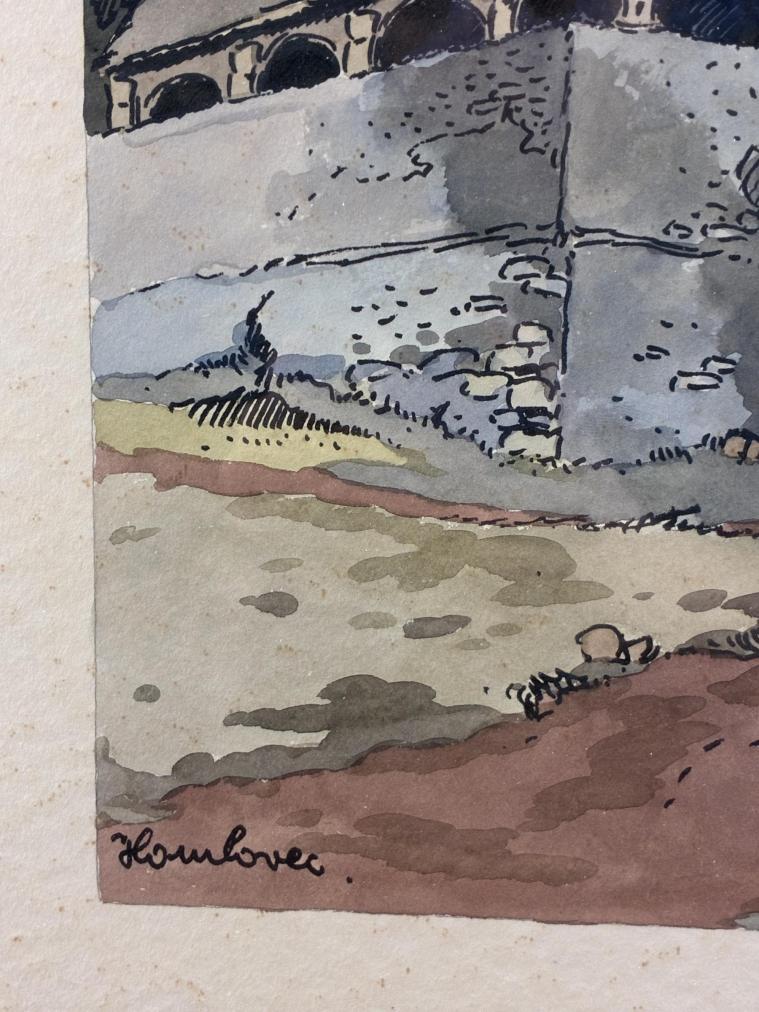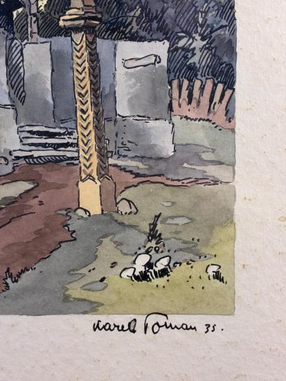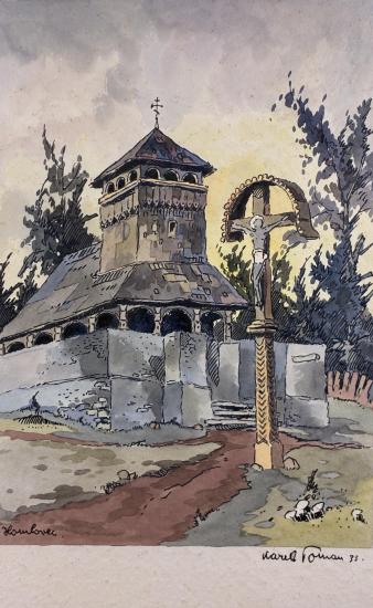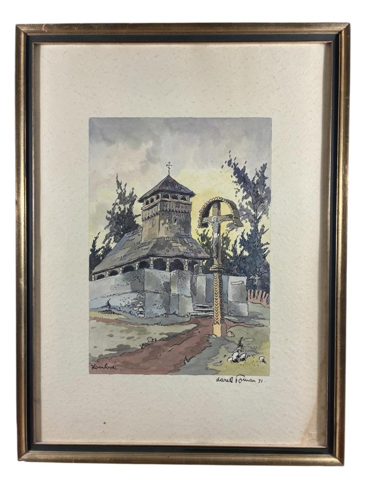 Dílo s motivem dřevěného kostelíka v krajině. Autor pracuje tak, že si rozloží motiv na jednotlivé barevné plochy, které skládá dohromady. Používá i černou obrysovou linku. Nad kostelíkem se stahují mračna, na obzoru zapadá slunce. Kombinovaná technika na papíře, rámováno pod sklem, rozměry s rámem 64 x 48 cm, rozměry díla 38 x 27 cm. Signováno vpravo dole "Karel Toman 35".