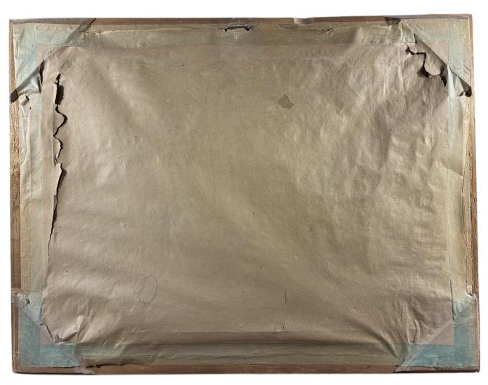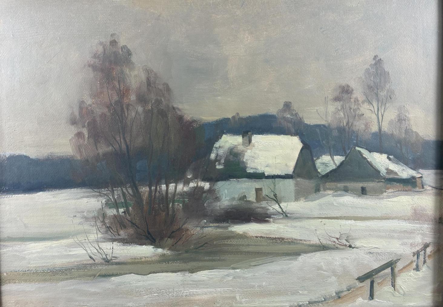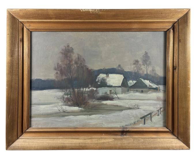 Příjemná krajinomalba od neznámého autora s motivem zimního období. V díle se rýsují vrstvy sněhu v různých odstínech bílé a šedé barvy, v pozadí stojí pár chaloupek. Umělec používá čisté plochy bez zbytečných detailů. Olej na kartonu, rámováno pod sklem, rozměry s rámem 62 x 48 cm. Nesignováno.