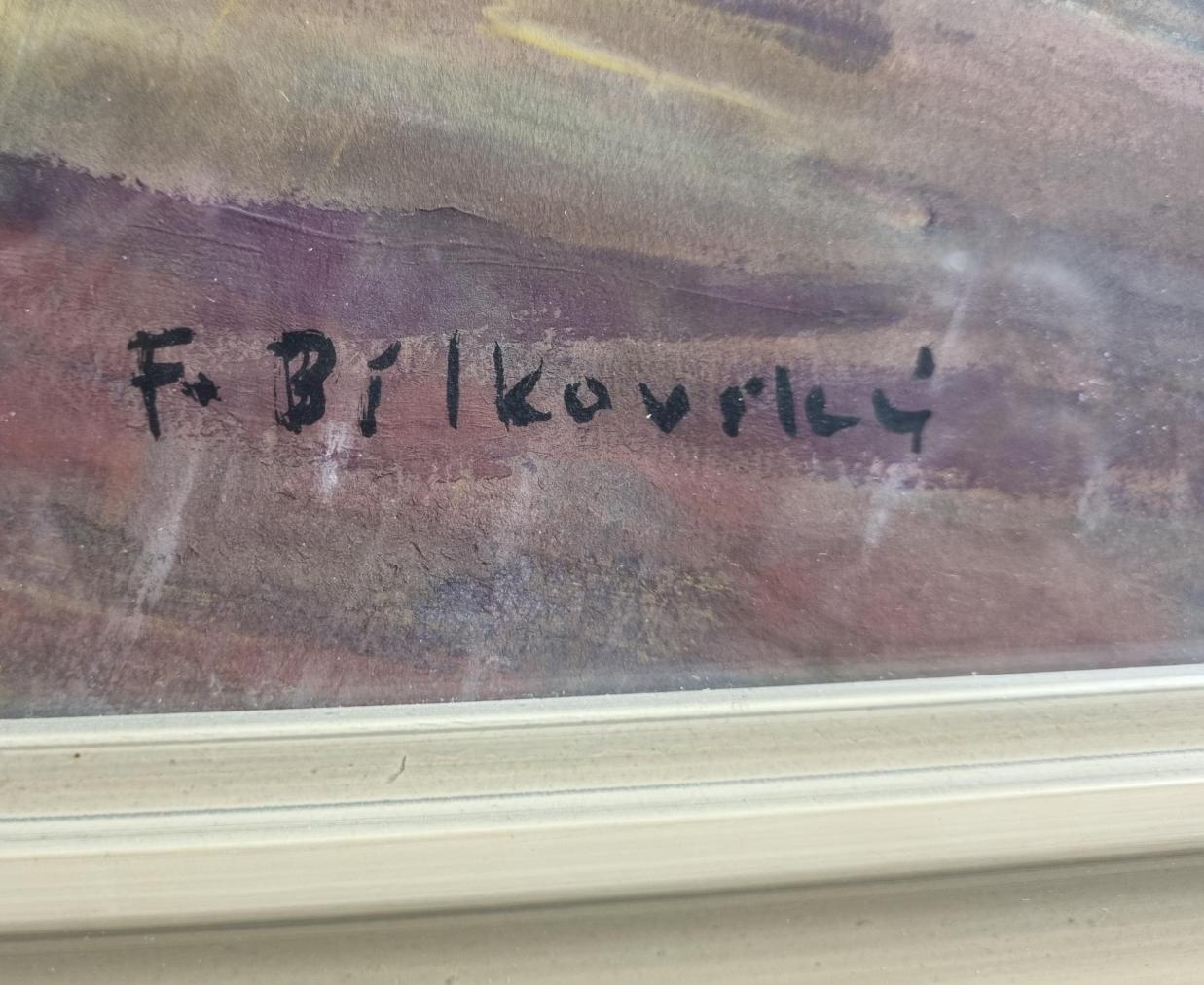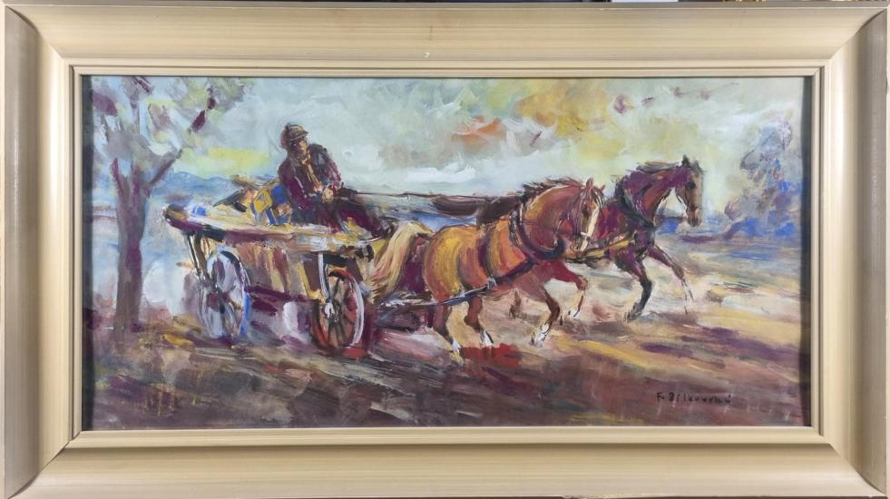 Dílo od Františka Bílkovského s jeho oblíbeným námětem koňů. Umělec sahá po pestrých odstínech, malba působí energicky a lehce expresivně, z krajiny se v jeho podání stává shluk barevných skvrn a ploch, nepřestává však působit realisticky. Motiv hraje všemi barvami a působí dynamicky. Akvarel na papíře, rámováno pod sklem, rozměry s rámem 87 x 49 cm, rozměry díla 71 x 34 cm. Signováno vpravo dole "F. Bílkovský".