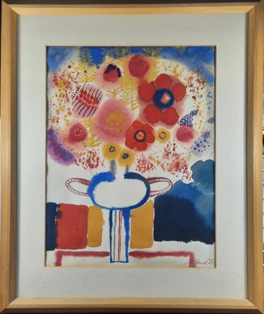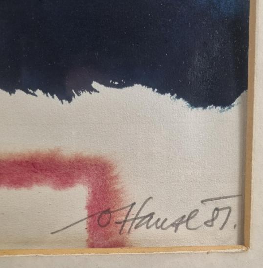 Dílo od výtvarníka Oldřicha Hanzla. Neotřelým způsobem vytváří pohled na zátiší, hojně využívá rozpitého efektu, díky kterému vznikají organicky vypadající plochy a tvary, které ohraničuje, usměrňujě či dopňuje o detaily. Obraz hraje teplými barvami a působí harmonicky. Akvarel na papíře, rámováno pod sklem, rozměry s rámem 71 x 85 cm, rozměry díla 59 x 45 cm. Signováno vpravo dole "O. Hanzl 87".