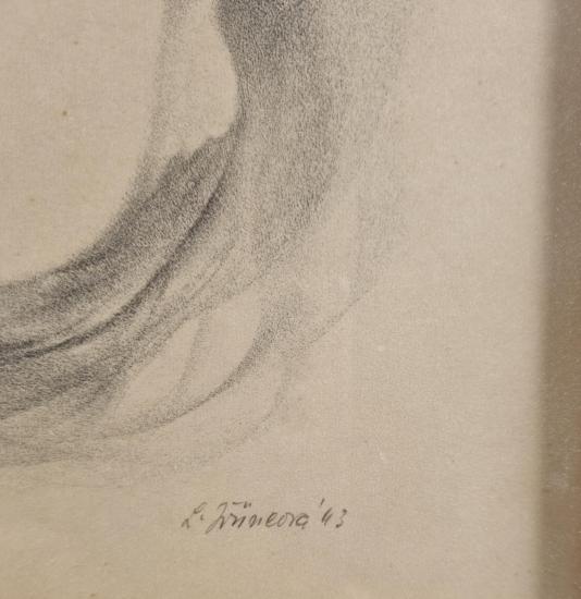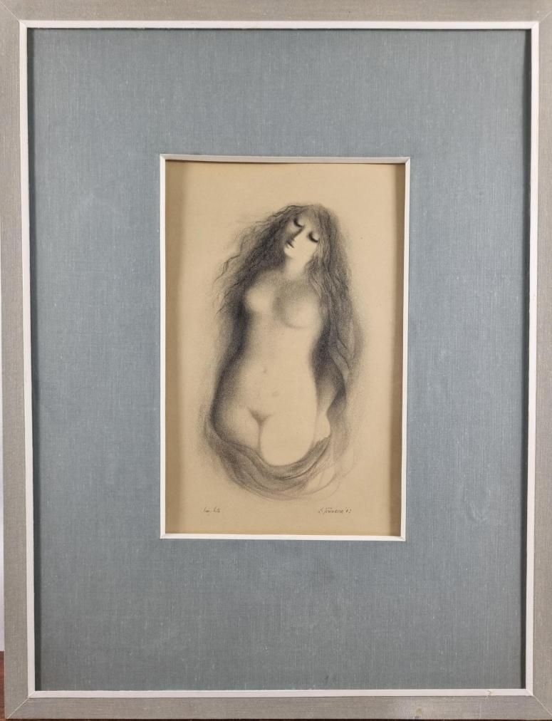 Grafika od Ludmily Jiřincové s námětem aktu ženy. Žena má zavřené oči a dlouhé vlnité vlasy lemují celé její tělo.Zdá se, že žena je přikryta drapérií či ponořená ve vodě, celý výjev působí snovým dojmem a je provedený velmi jemným zrnem, které skýtá litografie. Litografie na papíře, paspartováno pod sklem, rozměry s paspartou 48 x 38 cm, rozměry díla 22 x 14 cm. Signováno vpravo dole "L. Jiřincová 43".