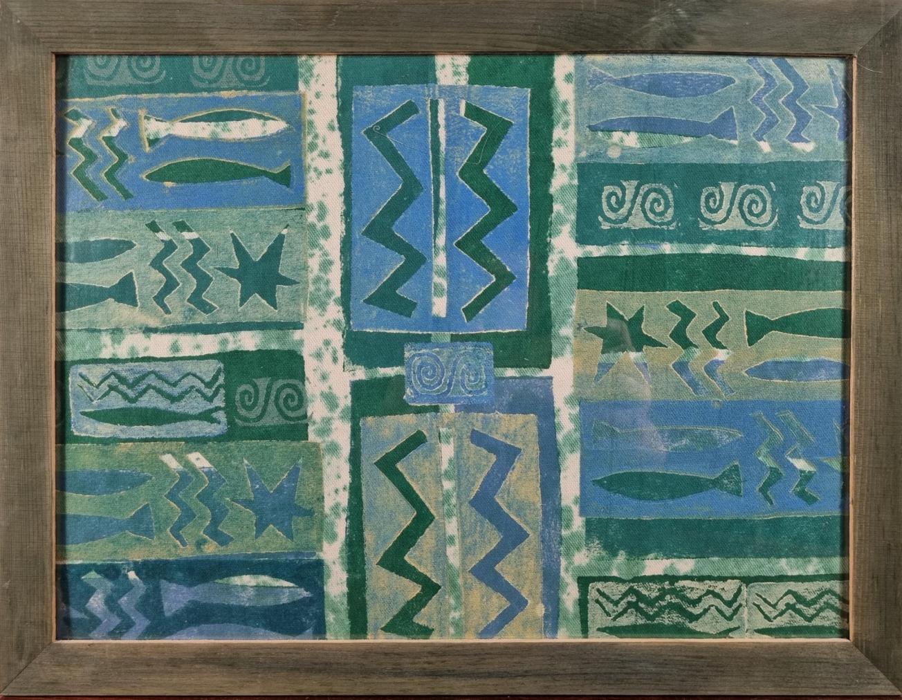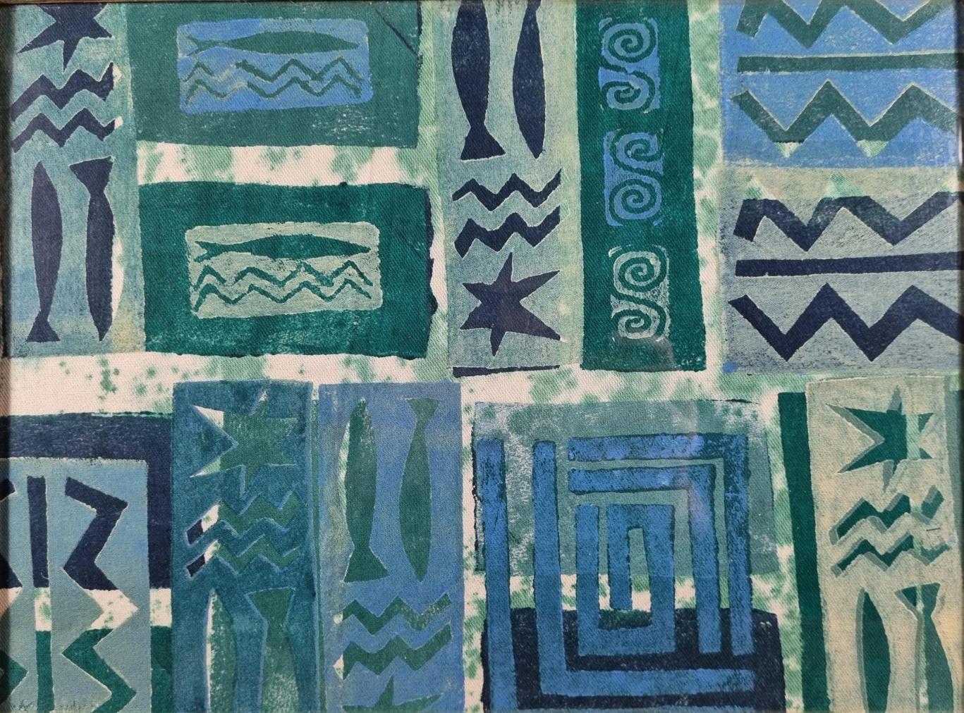 Dílo od Zuzany Krajčovičové v modrých a zelených odstínech. Umělkyně zaplňuje celý formát opakováním stejných symbolů, podklad vytváří za pomocí skvrn zelené barvy na světlé textilii. Poté vrství barevné plochy přes sebe. Kombinovaná technika na textilii, rámováno pod plexisklem, rozměry s rámem 43 x 33 cm, rozměry díla 27,5 x 37,5 cm. Nesignováno. Plexisklo má v jedné části rýhu.