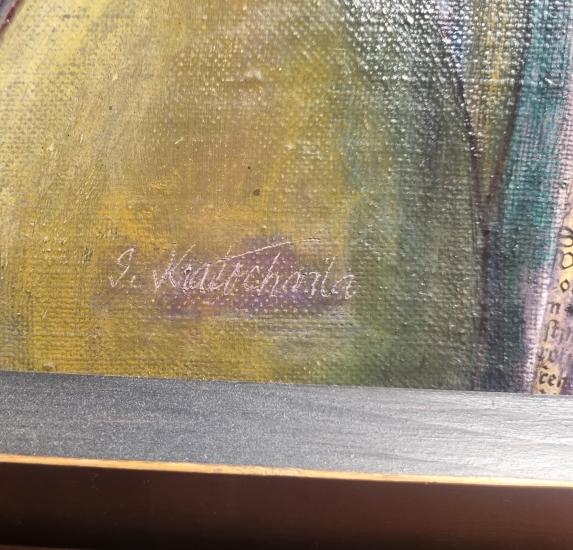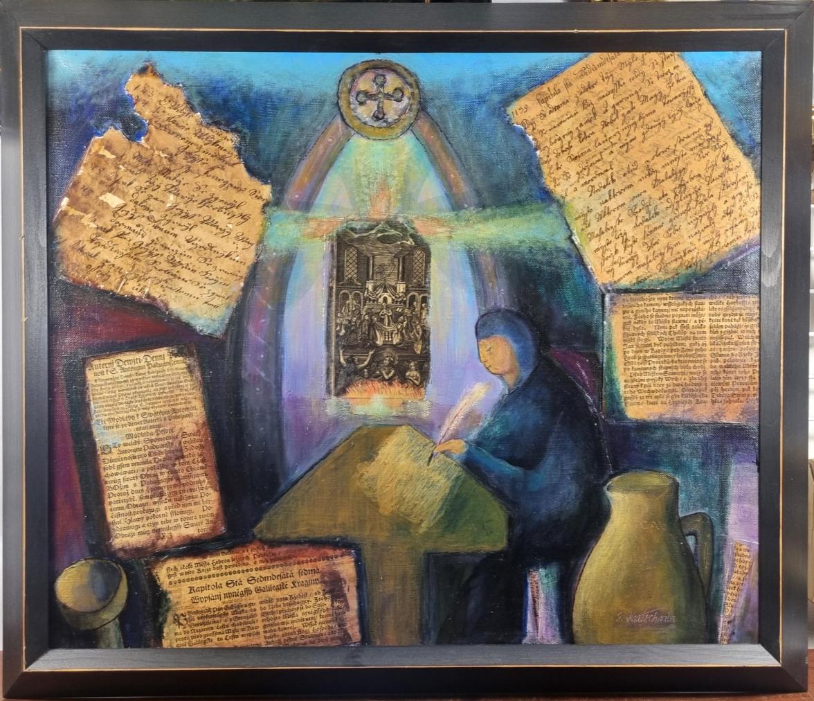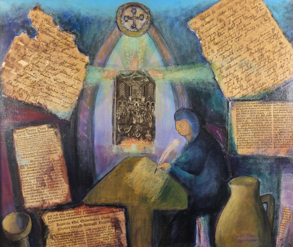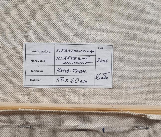 Dílo od Stanislava Kratochvíly s námětem klášterní knihovny. Umělec pojímá obraz jako malbu v kombinaci s koláží, malbou vytváří prostor knihovny s písařem, doplněné o fragmenty z knih a starých spisů. Z centra obrazu vychází zelená zář. Kombinovaná technika na plátně, rámováno, rozměry s rámem 68 x 59 cm, rozměry díla 59 x 48 cm. Signováno vpravo dole "S. Kratochvíla". Vzadu autorský štítek, rok 2006.