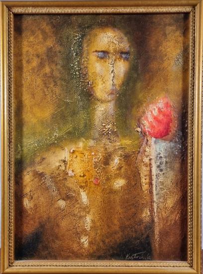 Drobné dílo s námětem figury, která drží růži. Malba je silně strukturální, umělec vytváří hrubou strukturou základní obrysy a tvary, které dobarvuje a halí do zemitých tónů. Rudá růže vyniká z celého díla nejvíce, dílo nese nostalgickouatmosféru. Kombinovaná technika na plátně, rámováno, rozměry s rámem 42 x 31 cm, rozměry díla 36 x 25 cm. Signováno vpravo dole "Kratochvíla".