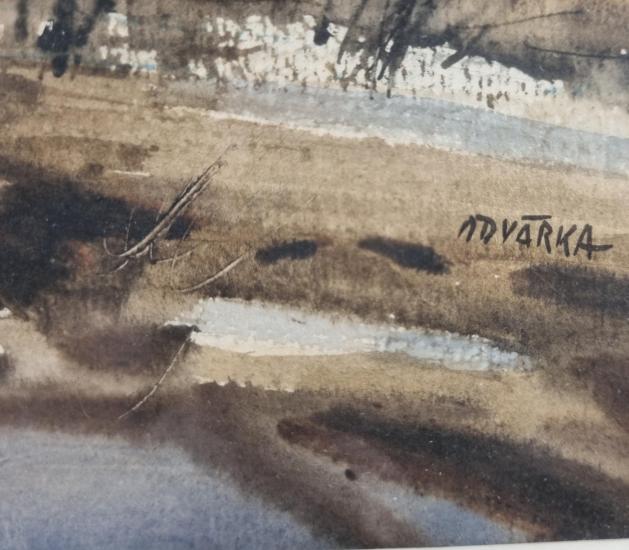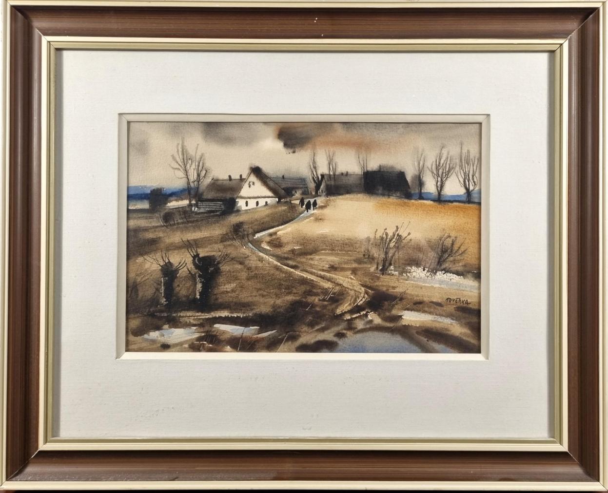 Klasický obraz od Jana Odvárky. V díle maximálně těží k techniky akvarelu, vytváří rozpitou, rozblácenou krajinu na pomezí ročních období, v krajině se tyčí několik holých stromů a jeden domek. Po cestě prochází pár postav. Akvarel na papíře, rámováno, pod sklem, rozměry s rámem 47 x 38 cm, rozměry díla 28 x 19 cm. Signováno ve spodní pravé části "Odvárka".