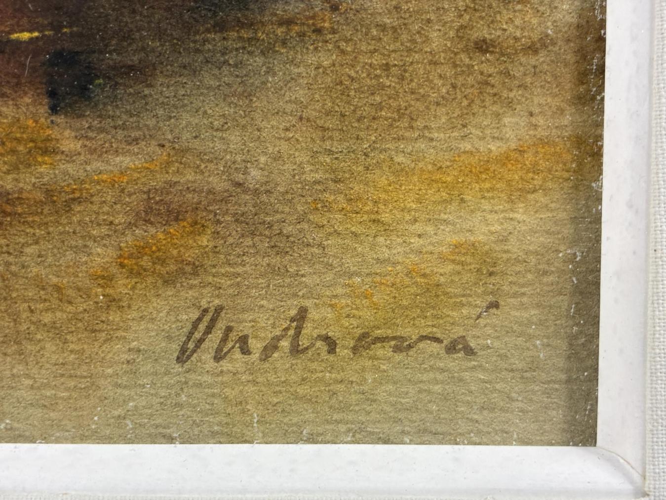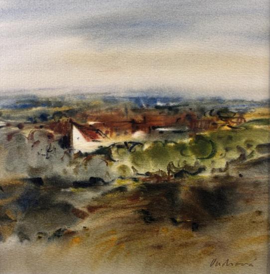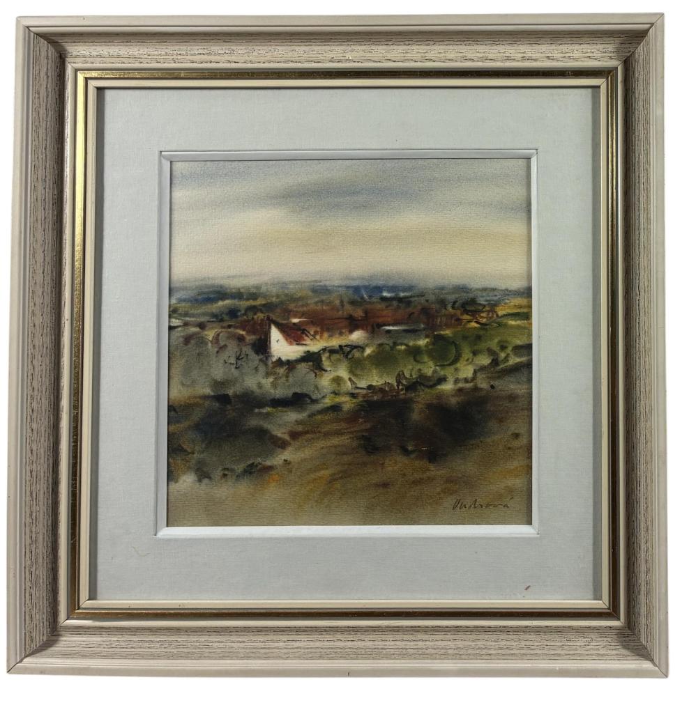 Příjemný akvarel s námětem krajiny s chaloupkami uprostřed. Technika kavarelu je zde v popředí, umělkyně vytváří příjemně syté, rozpité plochy, které prolíná a vzájemně se tak míchají i odstíny krajiny. V díle tak vzniká určitá měkkost. Akvarel na papíře, rámováno pod sklem, rozměry s rámem 40 x 40 cm, rozměry díla 23 x 23 cm. Signováno vpravo dole "Ondrová".