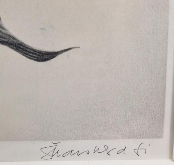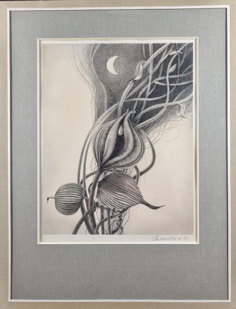 Zajímavé dílo od autora Jaroslava Škarohlída s florálním námětem. Motiv rostliny působí silně metafotricky, umělec vytváří jemnou, něžnou kresbu a tím posiluje poetický nádech obrazu. Tělo rostliny šplhá až do nebe, které pokryla temná noc. Litografie na papíře, paspartováno pod sklem, rozměry s paspartou 52 x 40 cm, rozměry díla 32 x 25 cm. Signováno vpravo dole "Škarohlíd J."