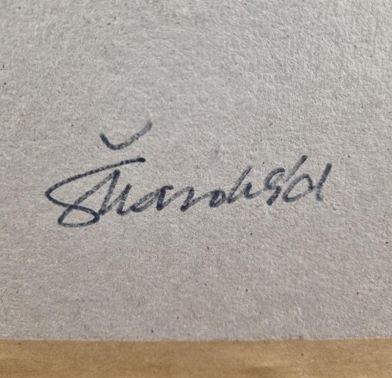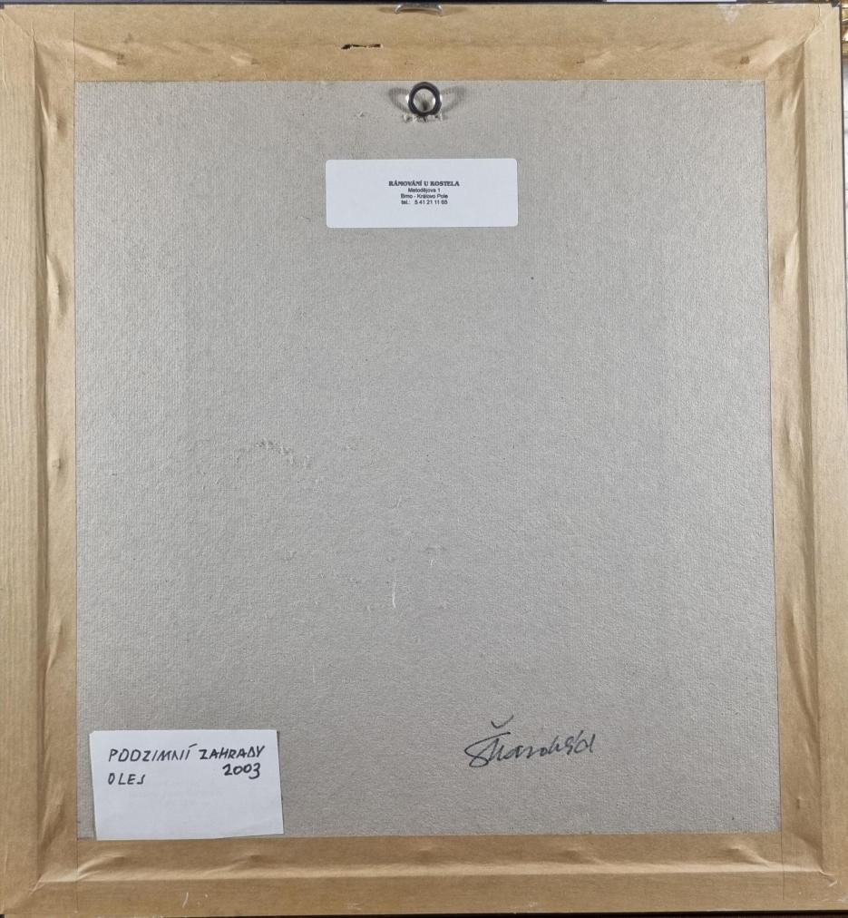 Zajímavé dílo od umělce Škarohlída s názvem Podzimní zahrady. Autor zajímavě přistupuje k formální stránce díla, místy vytváří silný reliéf, jinde vrství velké nánosy barvy, hnědá plocha působí jako skutečná zemina. Dílo jako by bylo průřezem zahradou. Olej na plátně, rozměry s rámem 47 x 44 cm, rozměry díla 27 x 24 cm. Signováno zezadu - "Škarohlíd, olej, 2003".