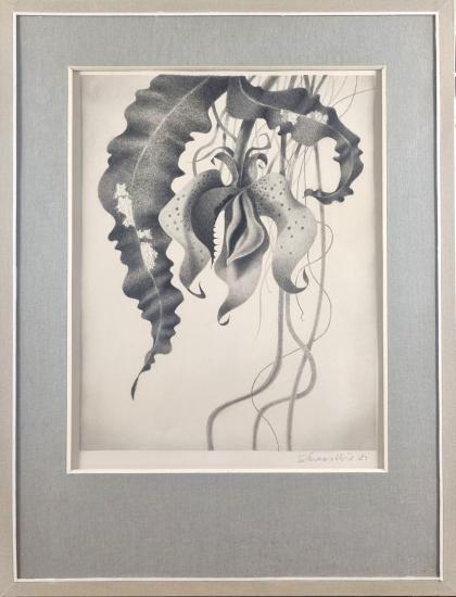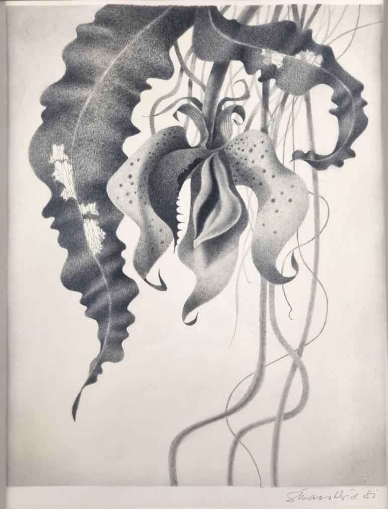 Dílo od umělce Jaroslava Škarohlída s námětem květiny. Autor vytváří rostlinu, která působí jako několik druhů najednou, v pozadí se rozprostírají dlouhé liány a v popředí vidíme květ, který působí jako orchidej. Umělec vytváří prostřednictvím techniky litografie jemnou kresbu ve stupních šedi, stínované plochy listů doplňuje o ostré detaily linkou. Litografie na papíře, paspartováno pod sklem, rozměry s paspartou 51 x 39 cm, rozměry díla 32 x 25 cm. Signováno vpravo dole "Škarohlíd J."