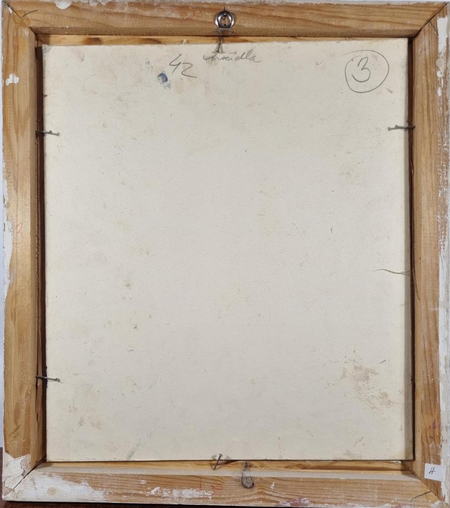 Příjemné dílo od umělce Škarohlída abstraktního charakteru. Umělec vytváří vlnitou strukturu za pomoci silného nánosu, kterou překývá modrou barvou. Kompozice vzniká z barevných ploch různé intenzity, místy je příjemná patina na povrchu. Kombinovaná technika na kartonu, rámováno, rozměry s rámem 46 x 41 cm, rozměry díla 37 x 32 cm. Nesignováno.