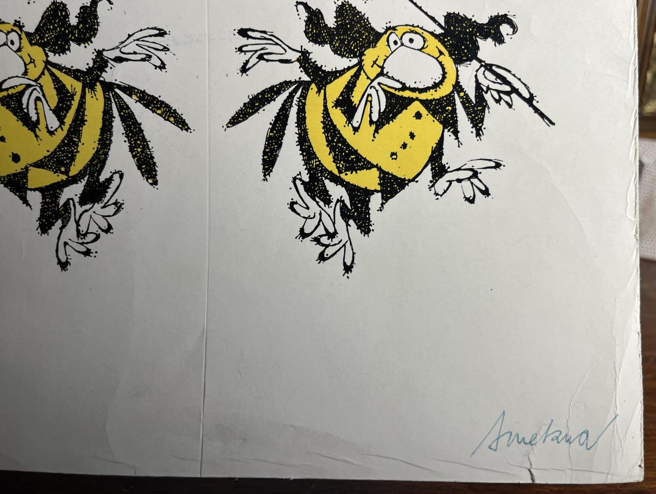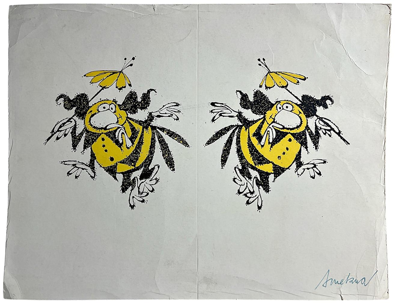 Roztomilé dílo od našeho známého výtvarníka Zdeňka Smetany, který je nejznámější svým zpracováním Rákosníčka a ostatních pohádkových postav. V tomto díle se symetricky zrcadlí postava čmeláka, autor vytváří bytosti, které působí trochu lidsky, zvířecí znaky stylizuje podle svého osobitého stylu a dodává jim na kouzelnosti. Sérigrafie na volně loženém papíře, rozměry 27 x 20,7 cm. Papír je po stranách lehce pomačkaný. Signováno originálním podpisem Smetana.