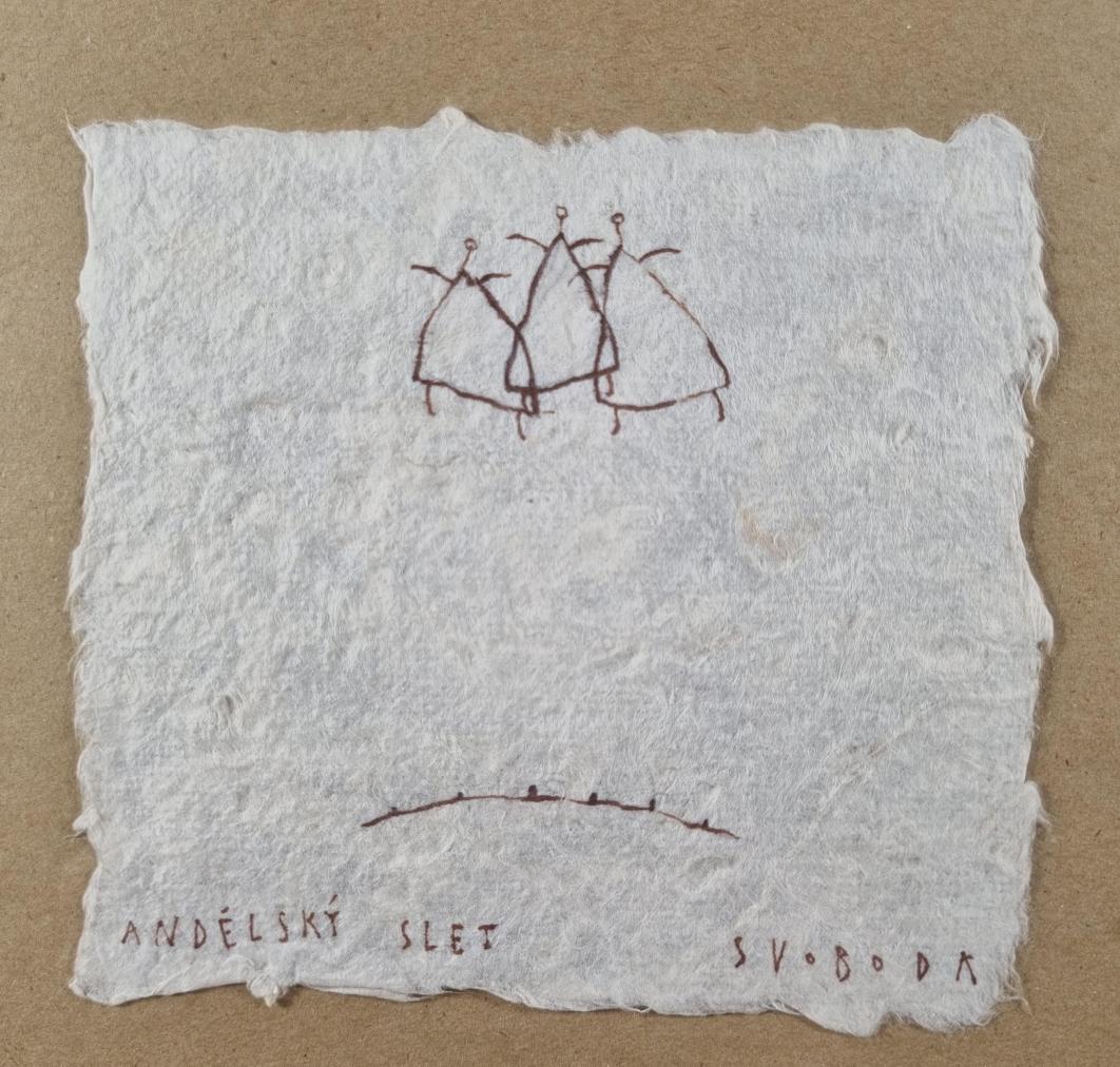 Milá kresba od Jana Svobody s názvem Andělský slet. Umělec pracuje s určitou dávkou vtipu, jednou linkou naznačuje ve spodní části zem, nahoře vytváří tři trojúhelníkové postavy, které značí anděly. To celé zasazuje do kontextu za pomocí názvu díla. Tuš? na ručním papíře, rámováno pod sklem, rozměry s rámem 25 x 25 cm, rozměry díla 12,5 x 13,5 cm. Signováno vpravo dole "Svoboda".