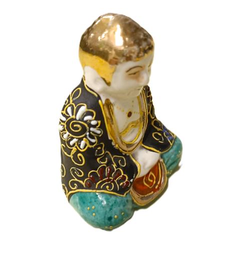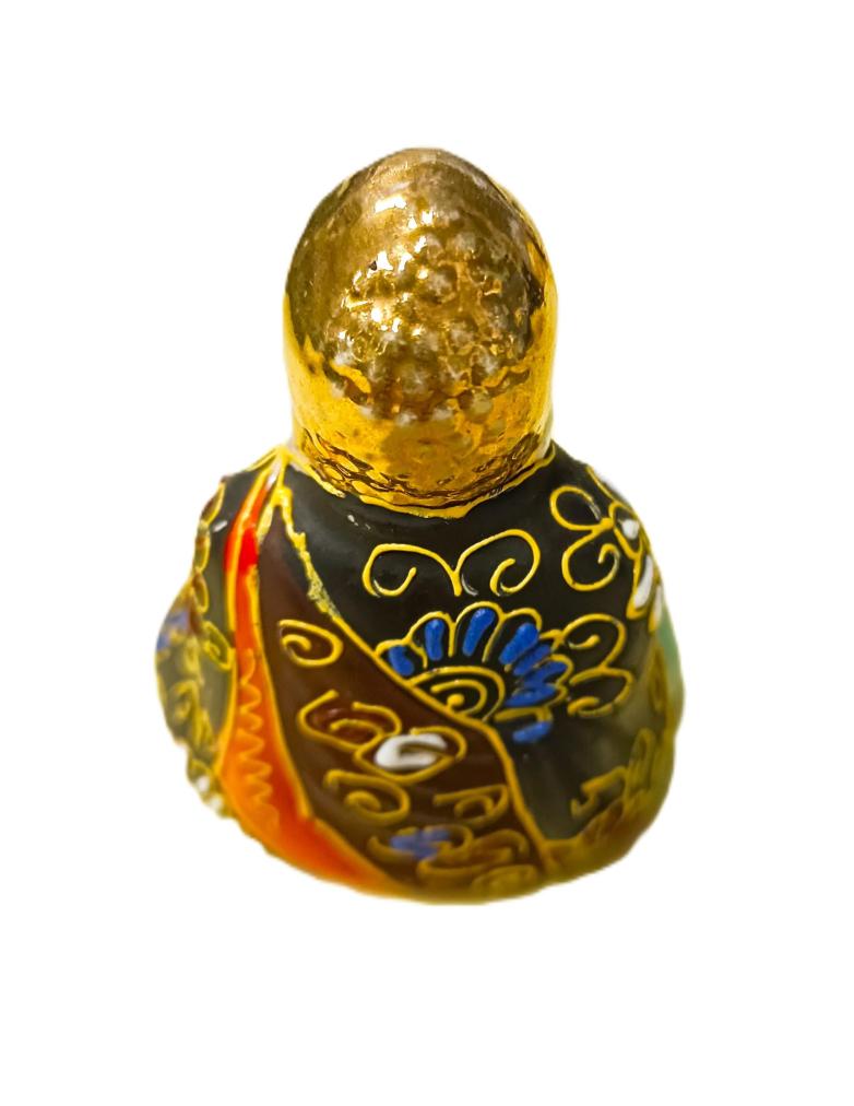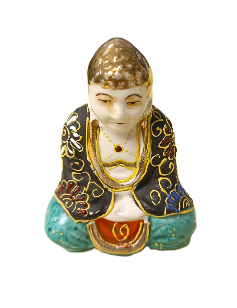 Krásná soška sedícího Budhy, malovaná, zlacená. Rozměry: 7 x 5 x 3cm. Stav a značka viz foto.