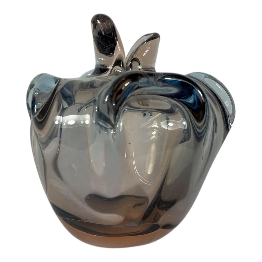 Autorská váza z hutního skla, v jemných modro-fialových odstínech. V nejvyšším bodě měří 15 cm, průměr hrdla je 1,5 cm. V nejširším bodě měří 12 cm. Průměr podstavy je 6,5 cm. Bez poškození, pouze pár škrábanců na podstavě. Neznačeno.