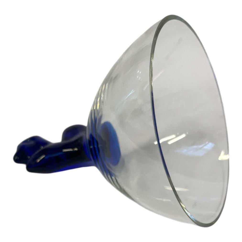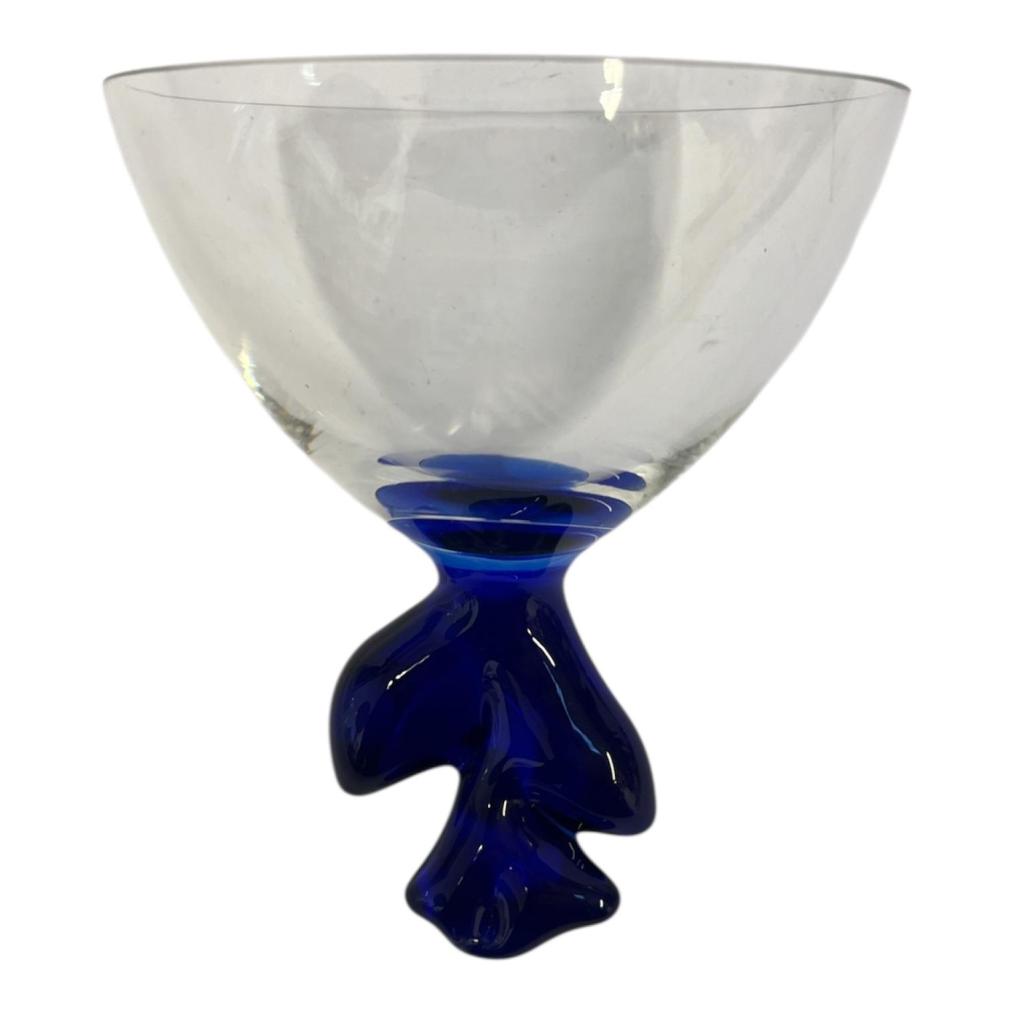 Skleněná číše bez nožky se zakončením z kobaltově modrého skla v podobě lístku. Celková výška je 13 cm, délka stopky je 6 cm, průměr hrdla je 10,5 cm.