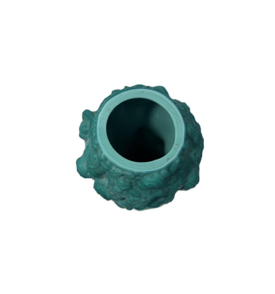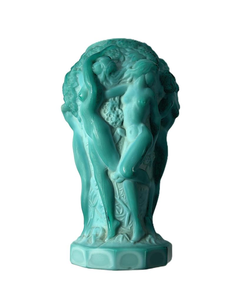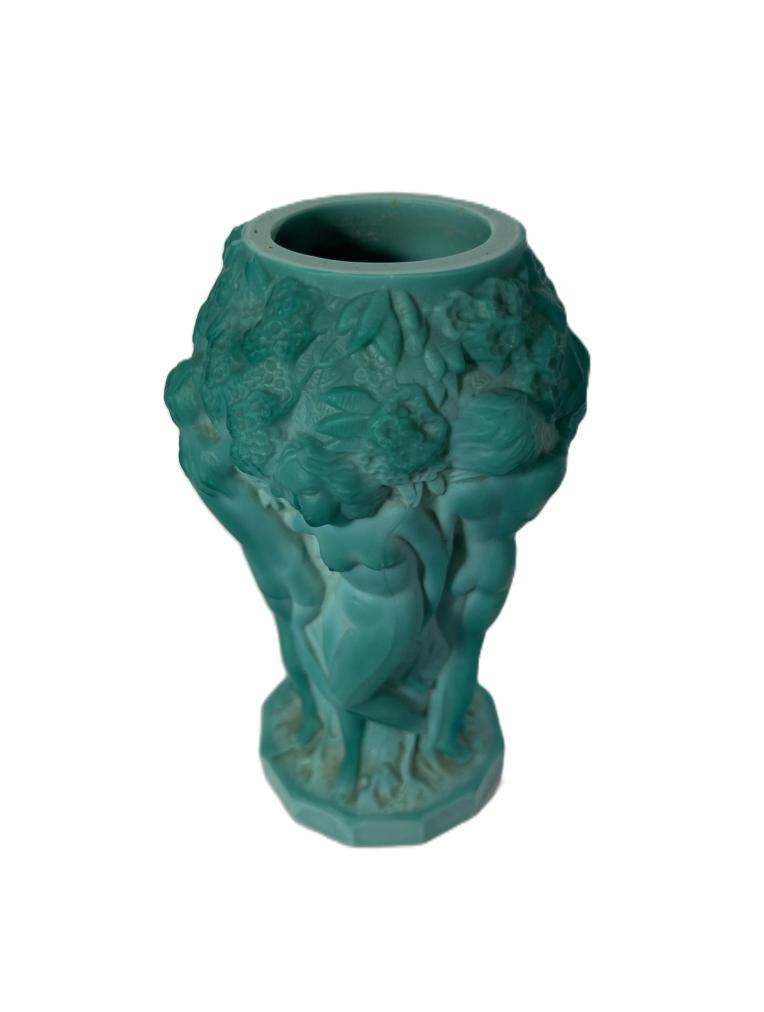 Starožitná Art Deco váza z tyrkysového skla s plastickým vyobrazením žen, které tančí okolo vinné révy. Na výšku měří 13 cm, vnitřní průměr hrdla je 3,5 cm, průměr podstavy je 5,5 cm. Váza je v perfektním stavu bez poškození pouze podstava je poškrábaná s jedním hlubším škrábancem. Neznačeno.