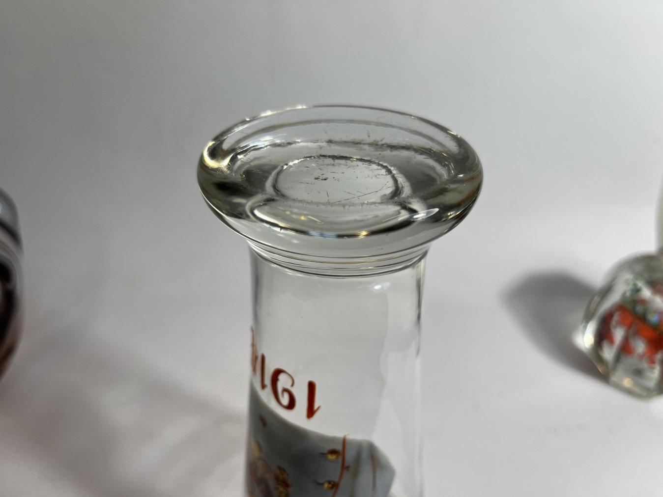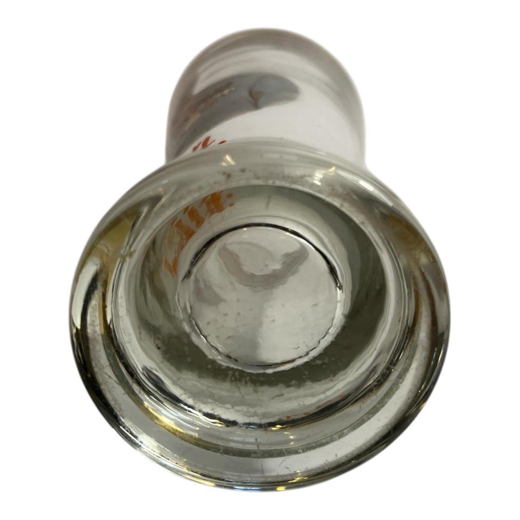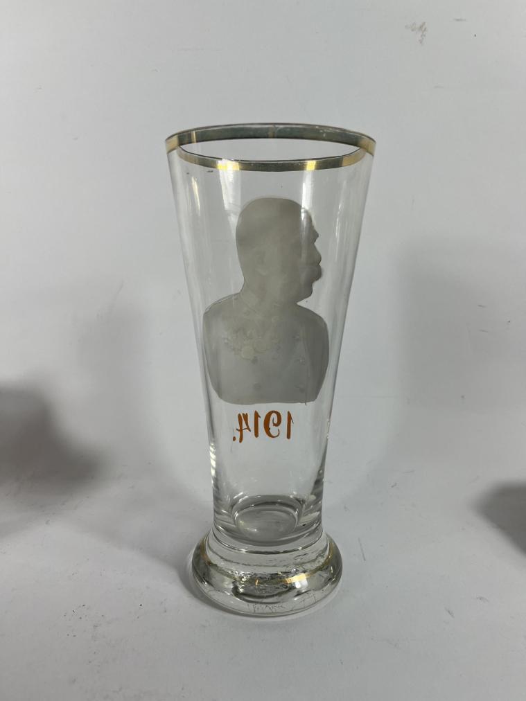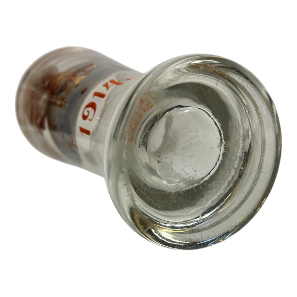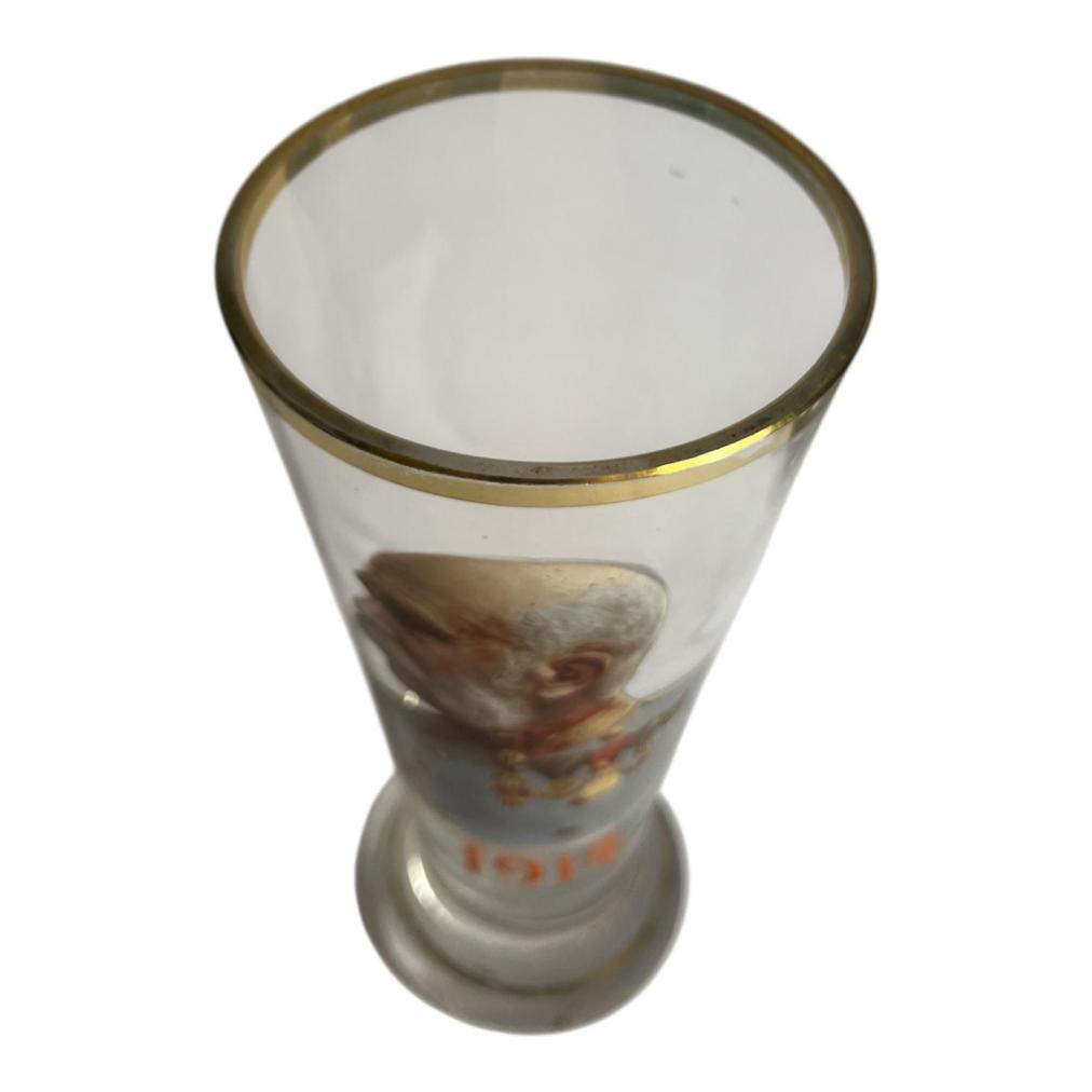 Starožitná sběratelská sklenice s podobiznou císaře Františka Josefa I. a malovaným letopočtem 1914. Sklenice má hrdlo lemované zlatou barvou, která je lehce setřená a na jednom místě chybí. Na výšku měří sklenice 20 cm, průměr hrdla je 8,5 cm, průměr podstavy je 7 cm. Podstava je mírně ošoupaná s několika škrábanci. Neznačeno.