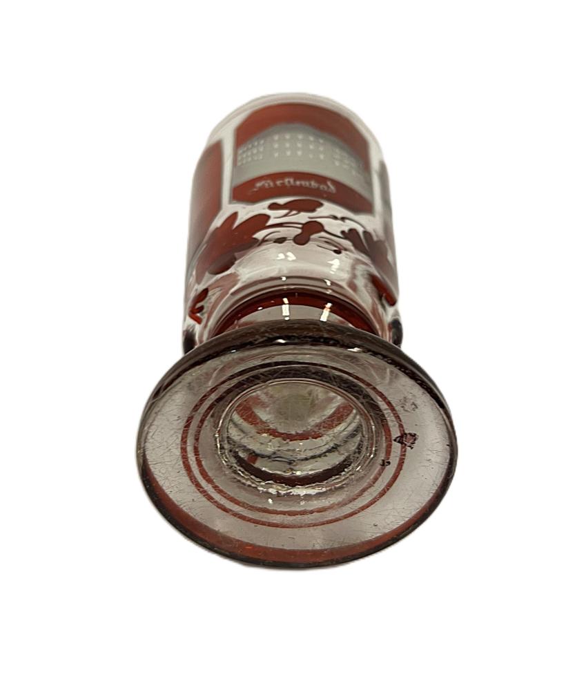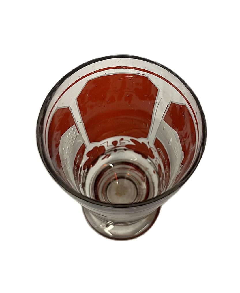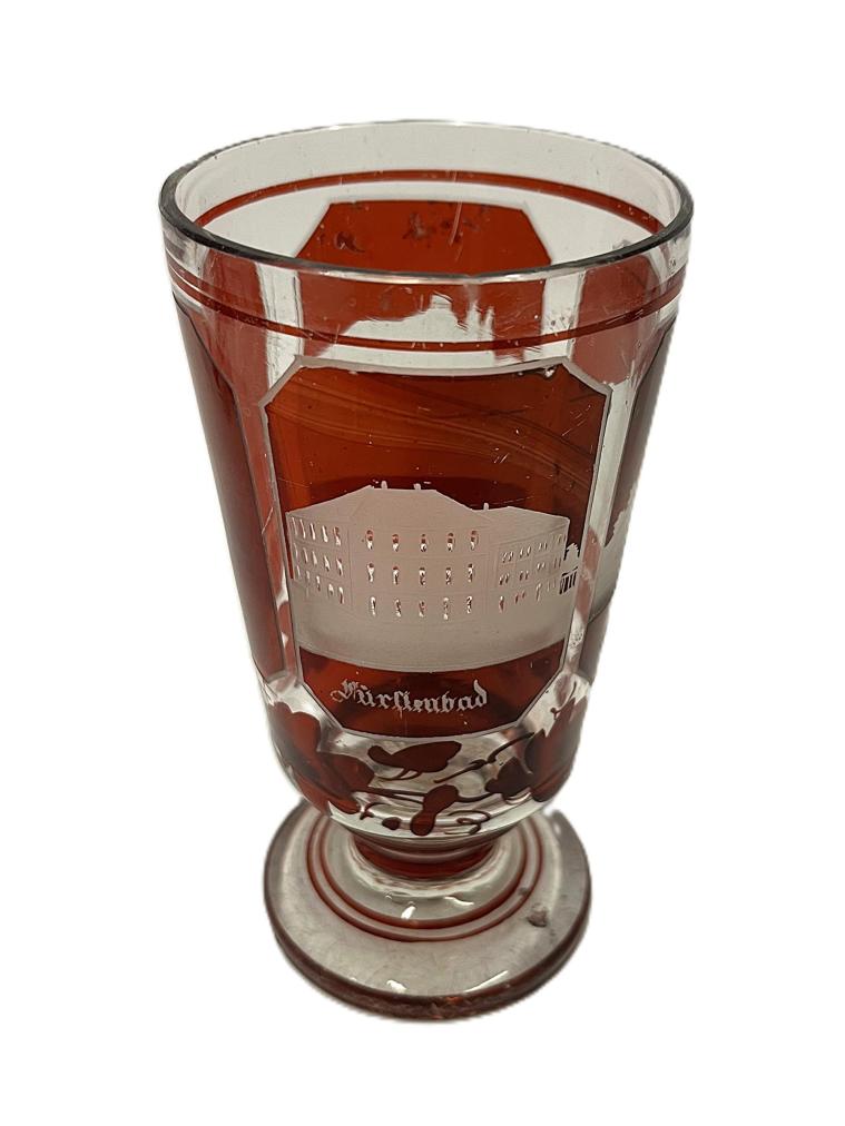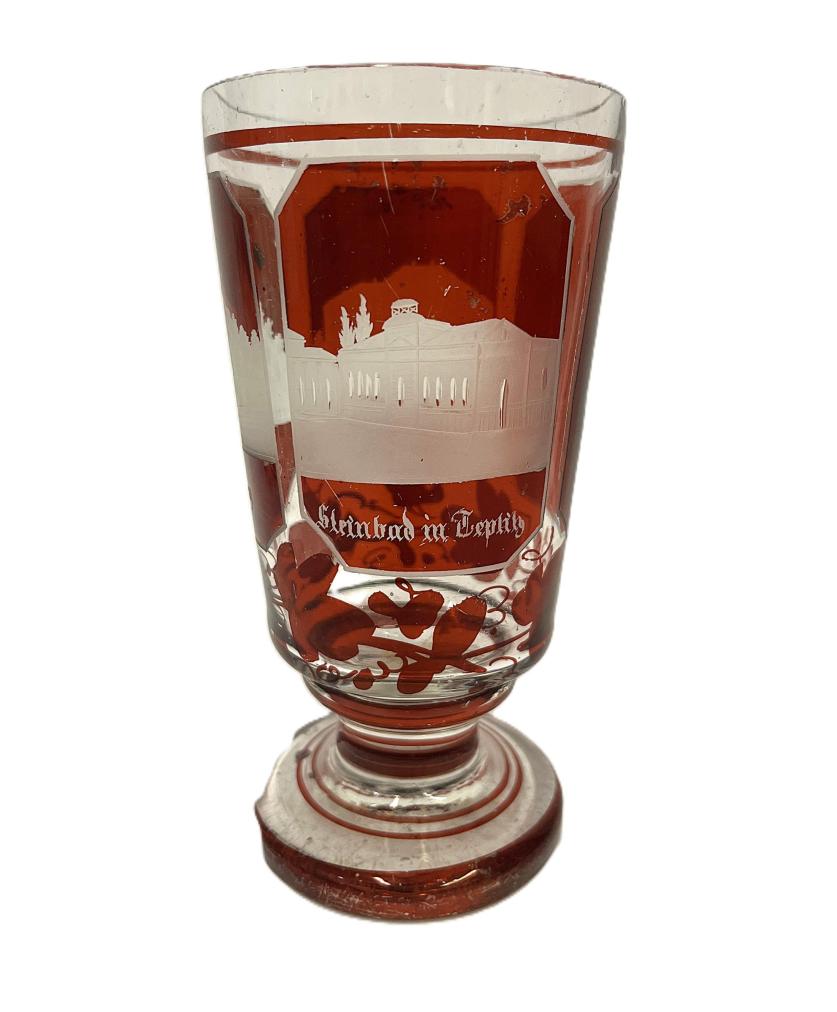 Nádherná lázeňská sklenice z období Biedermeier, přejímané sklo. Rudé zdobení je na sklenici i v podobě linek u okrajů, či rostliny vinoucí se po celém objemu. Výška 14 cm, průměr hrdla 7,5 cm, podstava 6,5 cm. Červené plochy jsou místy ošoupané, na podstavě je jeden oťuk, na hraně sklenice pár malých oťuků. Neznačeno. Rytina - Schlosberg, Teplitz..