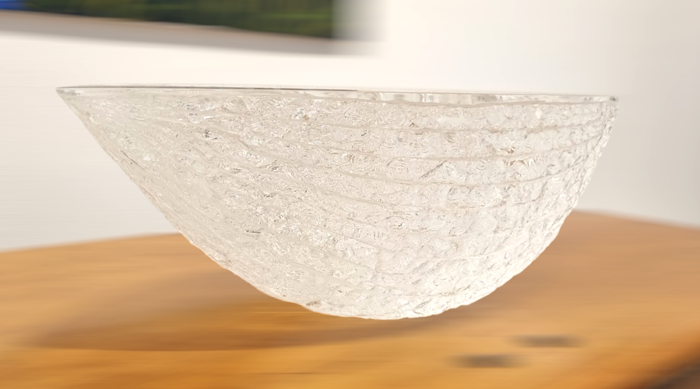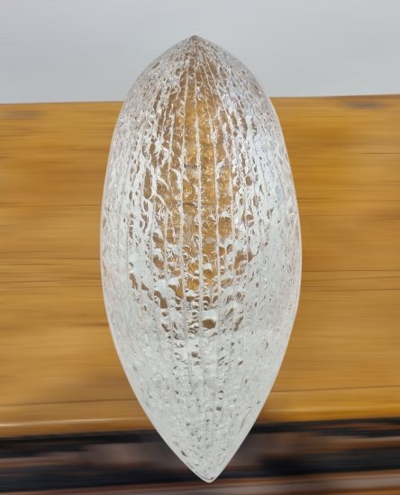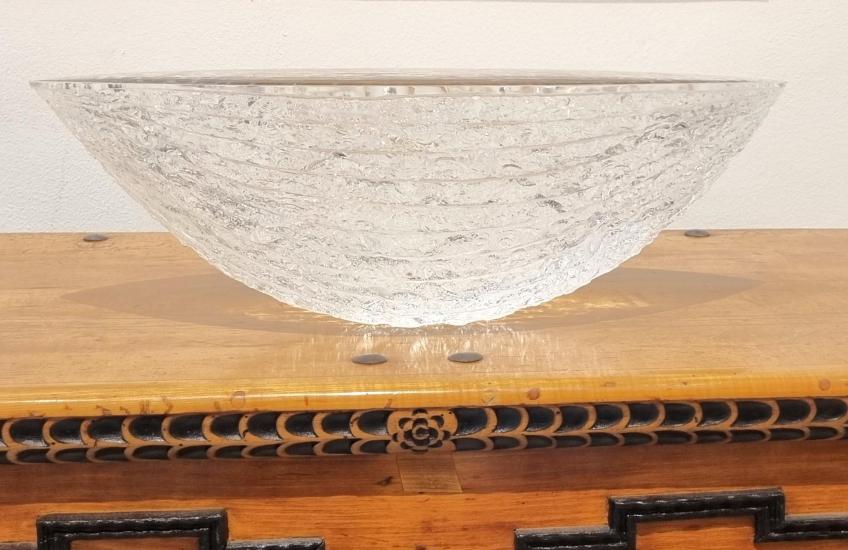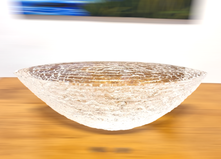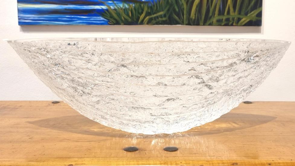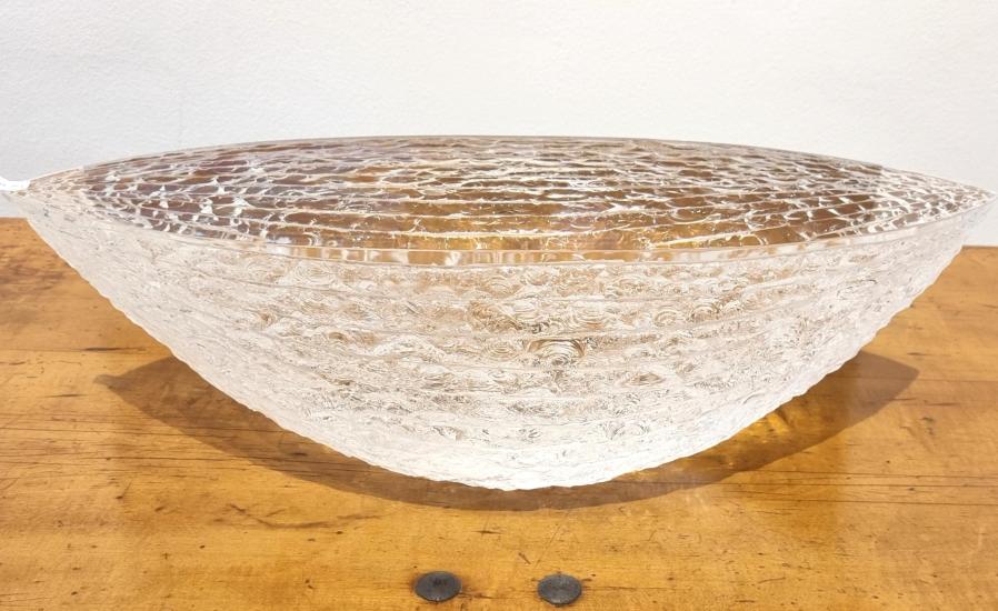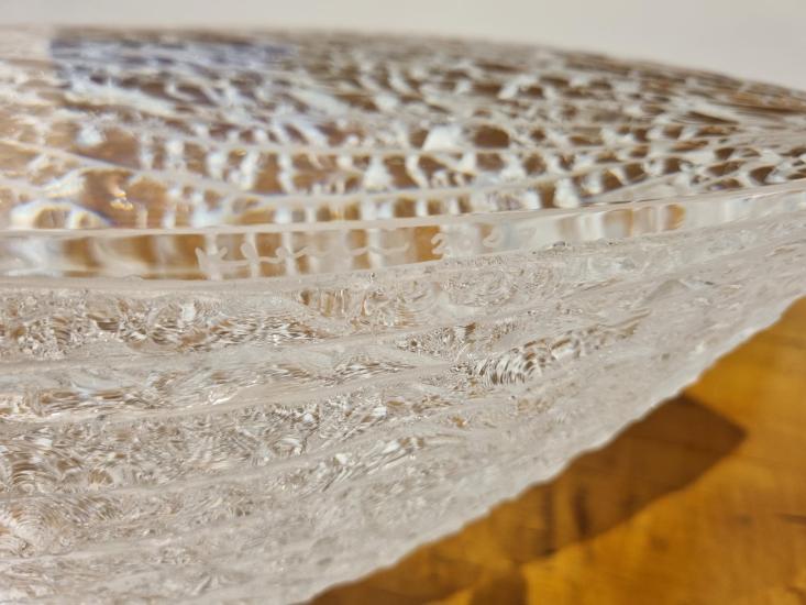 Svělý skleněný objekt od autora Vladimíra Kleina, který používá zajímavé a originální techniky k úpravě povrchu skleněných objektů, v tomto případě se jedná o odštěpování skla dlátem, čímž vznikají nádherné organické struktury. Výška 19 cm, rozměr plochy objektu 57,5 x 19 cm. signováno viz foto.