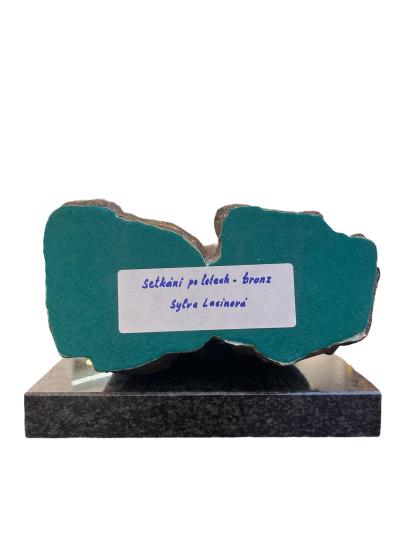 Originální bronzová socha od významné české sochařky Sylvy Lacinové plastika s názvem ´´Setkání po letech ´´ . Dilo vzniklo podle jejího návrhu z roku 1991- kolorované perokresby s názvem: Setkání ve žluté krajině. Celková výška plastiky i s žulovým podstavcem 27 cm. Bez podstavce 24 cm. Šířka a hloubka dle podstavce je 13 x 22 cm. Bez podstavce je 11 x 20 cm. Bronz, žula. V perfektním stavu bez poškození. Socha je na podstavci položená, není připevněná. Ze spodní strany je socha podlepená zelenou textilií pro měkký dosed. Neznačeno.
