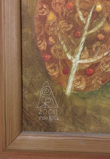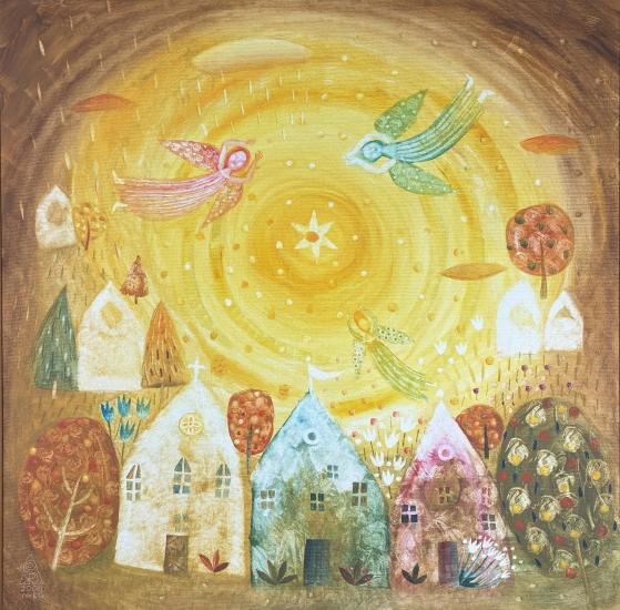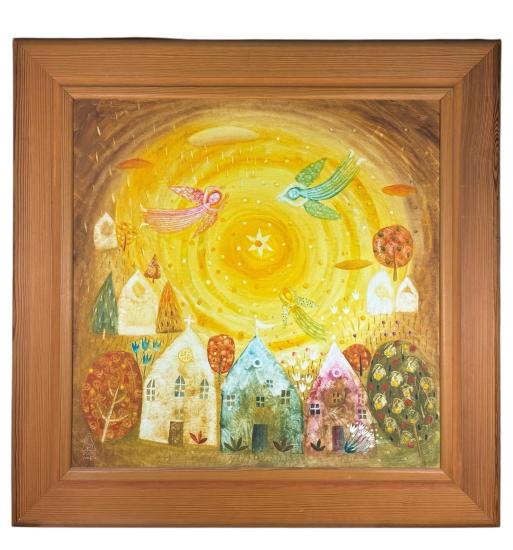 Pozitivní projasněná malba v naivním stylu, od autorky Renaty Štolbové. Malířka vyobrazuje v centru malby výraznou zlatou hvězdu, jejíž záře prostupuje celým obrazem. V popředí scenerie můžeme vidět malebná stavení a zjednodušené stromy s drobnými detaily, jako například jablka na stromu vlevo. Dílo dotváří dva strážní andělé, kteří z vrchu dohlíží na dění pod sebou. Olej na plátně, zarámováno do masivního dřevěného rámu. Signatura se nachází na pravé straně dole- Autorčin monogram a rok 2009.
