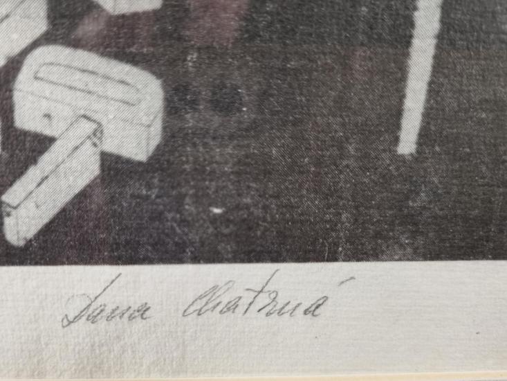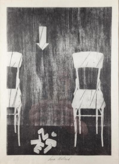 Grafické dílo od autorky Dany Chatrné, dcery významného českého umělce Dalibora Chatrného. Autorka v díle očividně odkazuje na přelomové dílo ,,Jedna a tři židle,, od Josepha Kosutha, silně konceptuální dílo, které změnilo tehdejší uvažování nad uměním a uměleckým jazykem. Vytváří dvě židle, mezi kterými je šipka odkazující k rozpadlému nápisu "židle". Suchá jehla na papíře, rámováno pod sklem, rozměry s rámem 50 x 38,5 cm, rozměry díla 30 x 21 cm. Signováno uprostřed "Dana Chatrná".