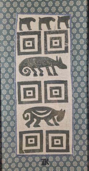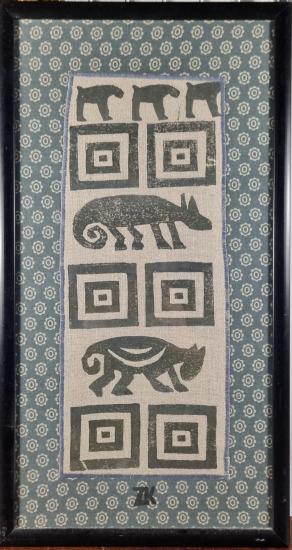Příjemné dílo se silně dekorativním charakterem. Umělkyně Krajčovičová sahá po ornamentu, který připomíná vizuální jazyk dávných domorodých kmenů, etnické vzory. Mezi vzory situuje postavy zvířat, pracuje s opakováním motivů. Kombinovaná technika na textilii, rámováno pod sklem, rozměry s rámem 53,5 x 28,5 cm, rozměry díla 50 x 25 cm. Signováno dole uprostřed "Z.K."