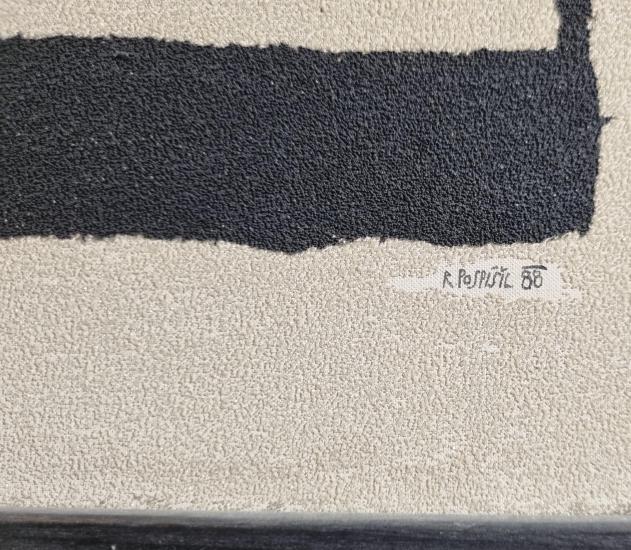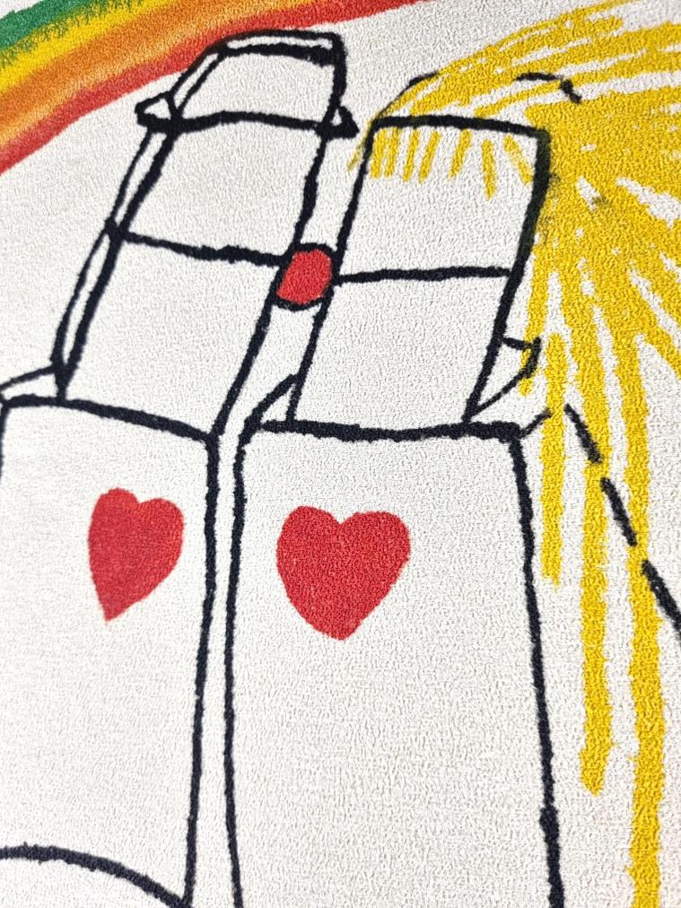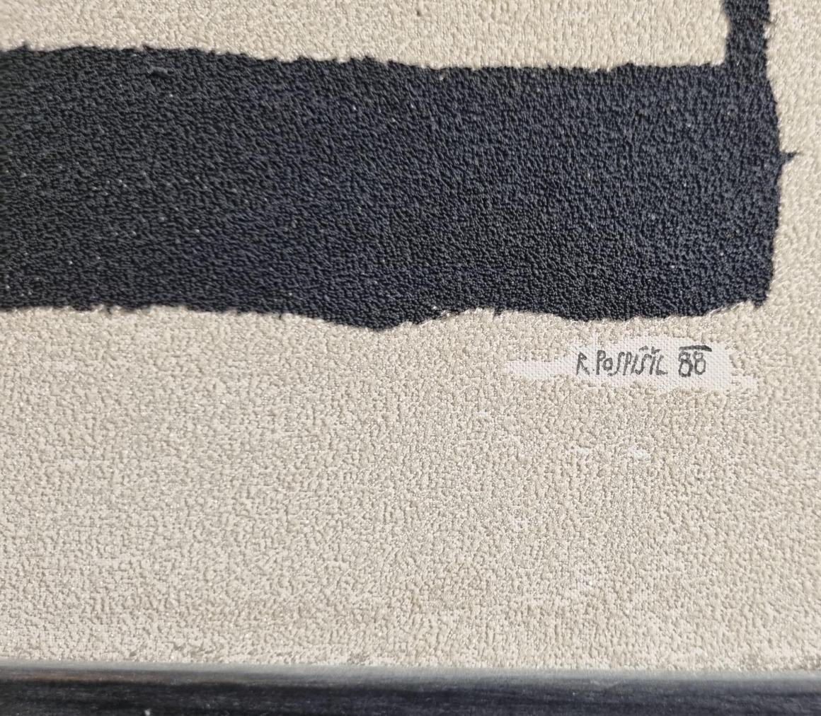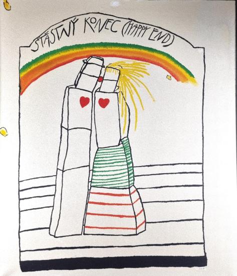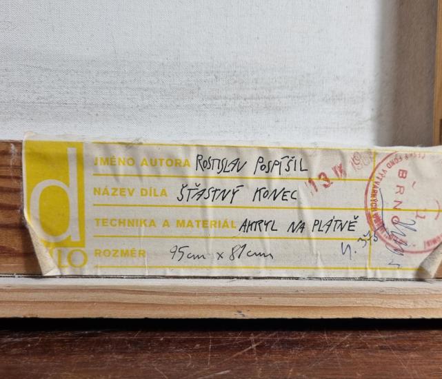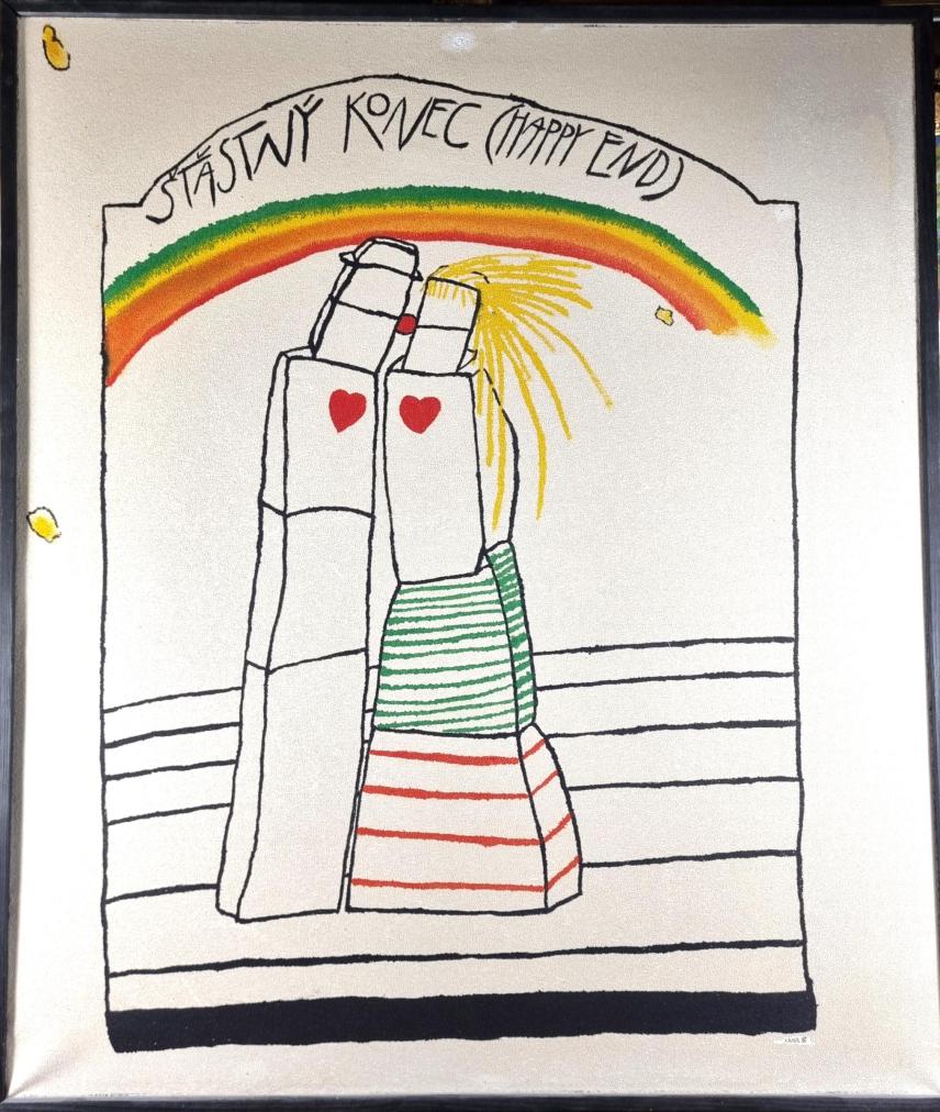 Vtipné, pozitivně laděné dílo od Rostislava Pospíšila. Umělec pracuje s vlastní stylizací, v tomto díle parafrázuje figuru podle sebe - vytváří ji z geometrických tvarů, které staví na sebe. Ženu odlišuje dlouhými vlasy a pruhovanými šaty, postavy se tisknou k sobě a sledují duhu, která se před nimi rozprostírá. Umělec zajímavým způsobem upravuje povrch plátna a tak vzniká písčitá struktura, do které se vpíjí barva. Akryl na plátně, rámováno, rozměry s rámem 84 x 98 cm, rozměry díla 80 x 94 cm. Signováno vpravo dole "R. Pospíšil", zezadu autorský štítek - viz foto.