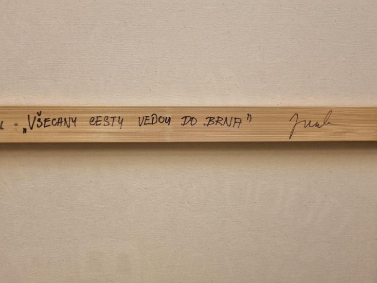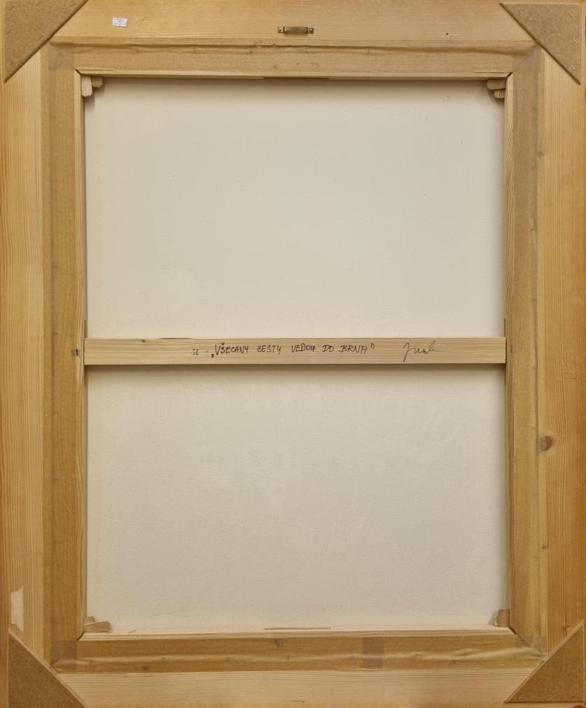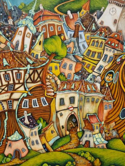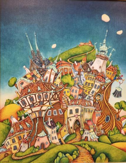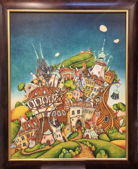 Klasické dílo od autora Františka Jurka, jehož stylizace je osobitá a velmi snadno rozpoznatelná. Výjev působí silně pohádkově, autor pracuje s rozvlněnými linkami, velkým počtem detailů, budovy tančí a prohýbají se, jako by byly živé. Jurek pracuje s mírou nostalgie a naivity, jeho díla působí vesele a hravě, a to po stránce obsahu i formy. Olej na plátně, rámováno, rozměry s rámem 112 x 92 cm, rozměry díla 94 x 74 cm. Signováno vlevo dole "Jurek 08".