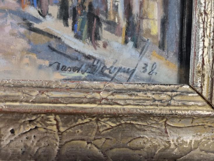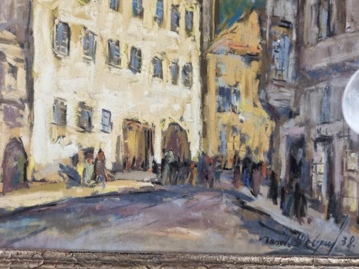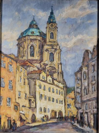Na obraze se nachází kresba křídovými barvami chrámu sv. Mikuláše v Praze na Malé Straně. Díky technice kresba na papíře vložena mezi dvě skla působí zároveň velmi konkrétně, ale také kvůli nedodělaným detailům dává prostor k imaginaci. Před chrámem je rušno, lze si povšimnou pohybujících se postav ve stínu, ale i ve svitu odpoledního slunce. Obraz je zarámovaný a pod sklem. Struktura rámu dodává dojem popraskání a spodní okraj je viditelně poškozený. Rozměry obrazu i s rámem jsou: 81,5 cm x 46 cm. Signováno viz foto.