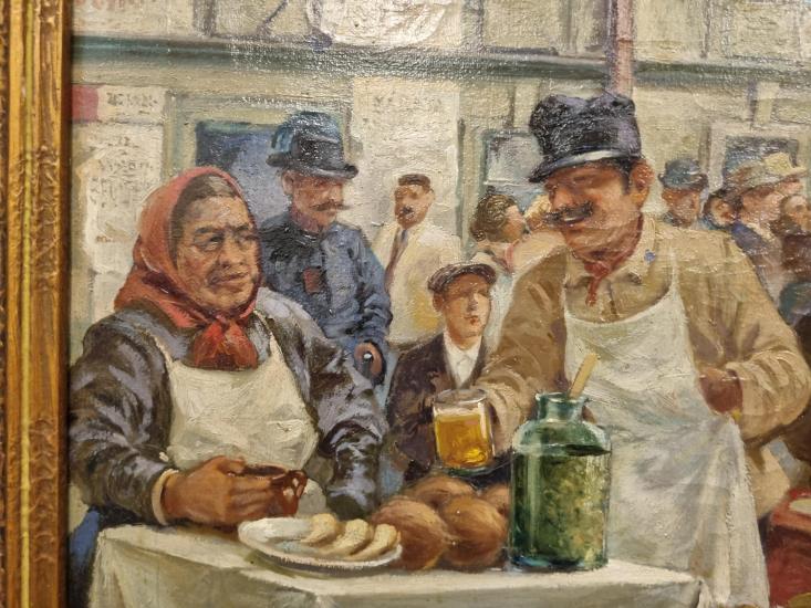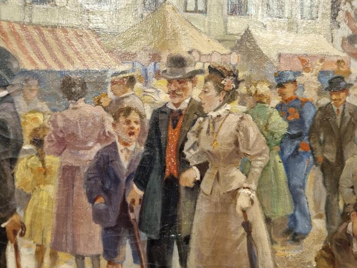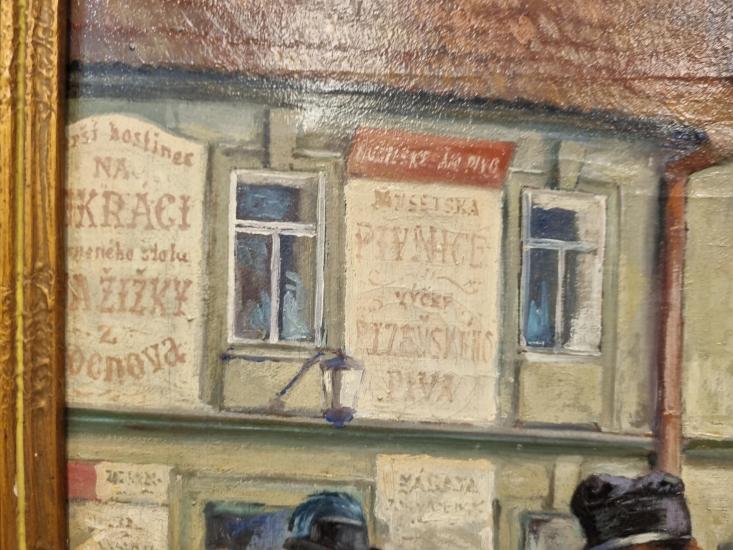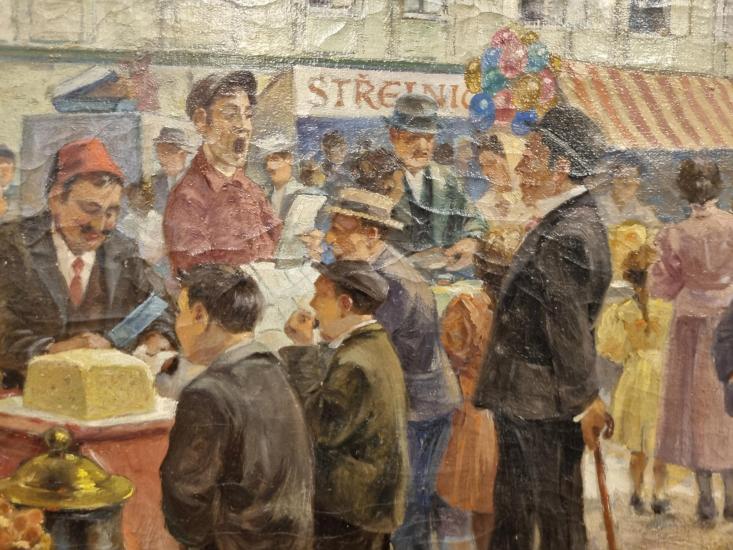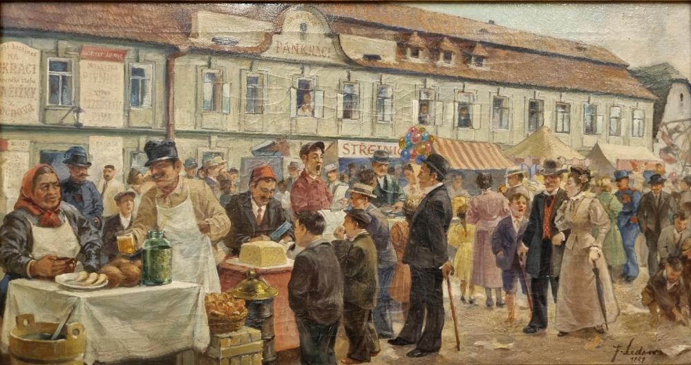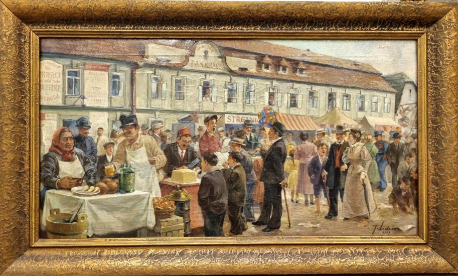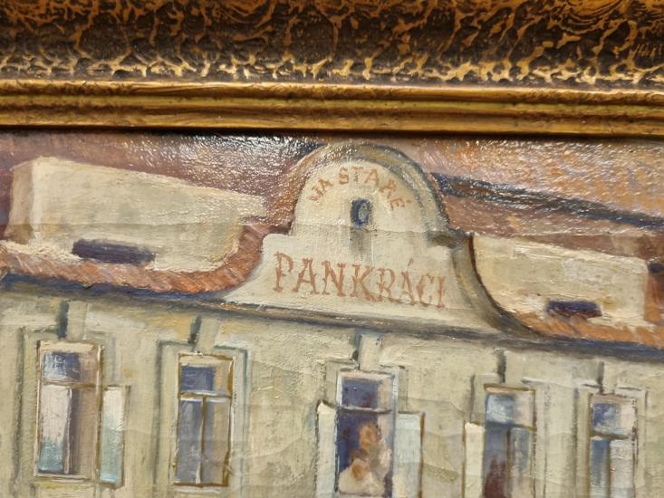 Veselé, energické dílo hrající barvami a usměvavými tvářemi, od českého umělce jménem František Leden. Autor vykresluje náměstí v Praze na Pankráci, které je o pouti plné stánkařů, návštěvníků a dobrého jídla a pití. Malíř nešetří detaily a při každém pohledu se před divákem rozvine nový příběh. Olej na plátně. Zarámováno do dřevěného rámu zlaté barvy s tmavou patinou. V barvě obrazu se nachází krakeláž. Signováno na pravé straně dole: F. Leden, 1949. Rozměry malby jsou 73 x 38 cm. Celkové rozměry s rámem jsou 86,5 x 51,5 cm.