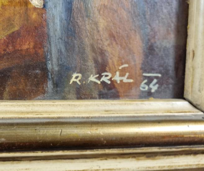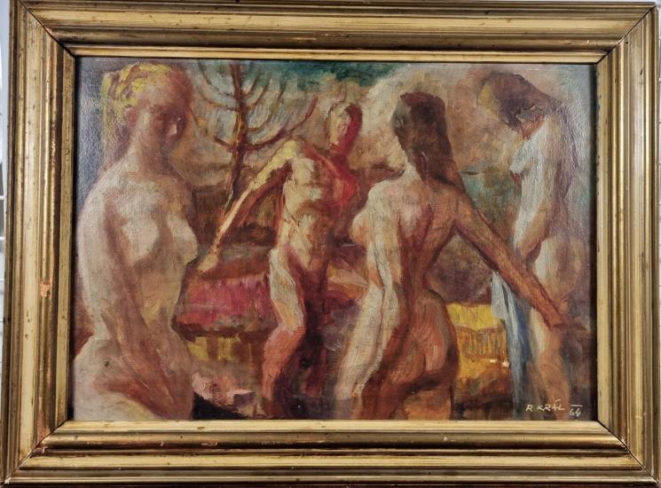 Nádherné dílo od autora Krále s námětem figur v krajině. Nahá těla i krajina jsou tvořeny zemitými tóny barev, které jsou typické pro podzim, za postavami se rýsuje abstraktní krajina a rudá vodní hladina. Tváře jsou anonymní, umělec vytváří poetickou situaci plnou magické atmosféry. Malba je hutná, mnohovrstevnatá. Obraz má na třech místech odřenou barvu, ve spodní části je lehce poškozen povrch malby. Olej na sololitu, rámováno, rozměry s rámem 60 x 45 cm, rozměry díla 48 x 33 cm. Signováno pravo dole "R. Král".