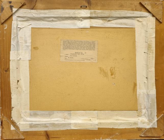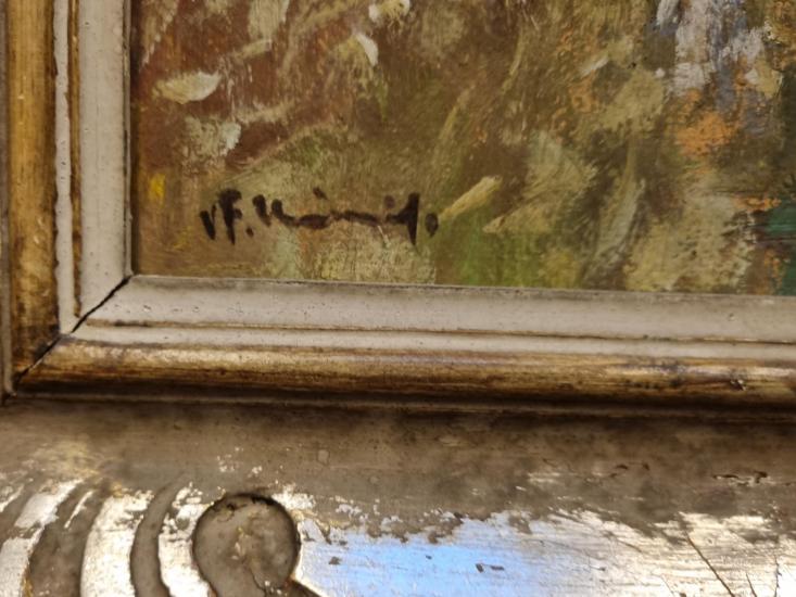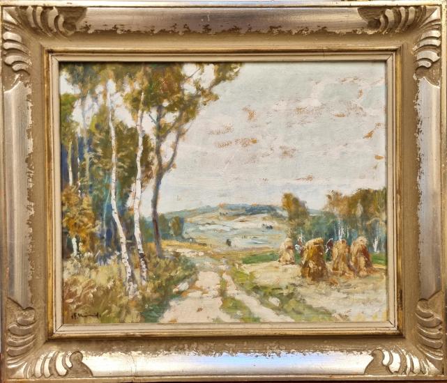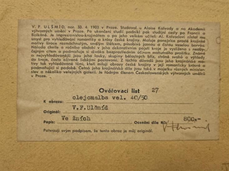 Skvělá krajinka s námětem cesty, podél které se tyčí pokroucené kmeny břízy. Po pravé straně stojí snopy sklizené slámy, umělec pracuje s hutností a hrubší malbou bez jemných detailů. Zajímavě pracuje s rozostřením, pár motivů z obrazu vystupuje a zbytek nechává vyznít v zastřenosti. Olej na sololitu, rámováno, rozměry s rámem 64 x 55 cm, rozměry díla 48 x 40 cm. Signováno vleo dole "V. F. Ulšmíd".