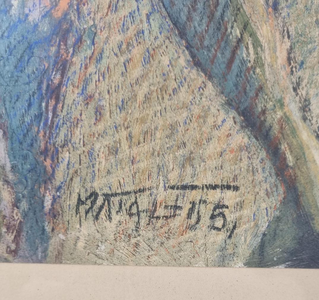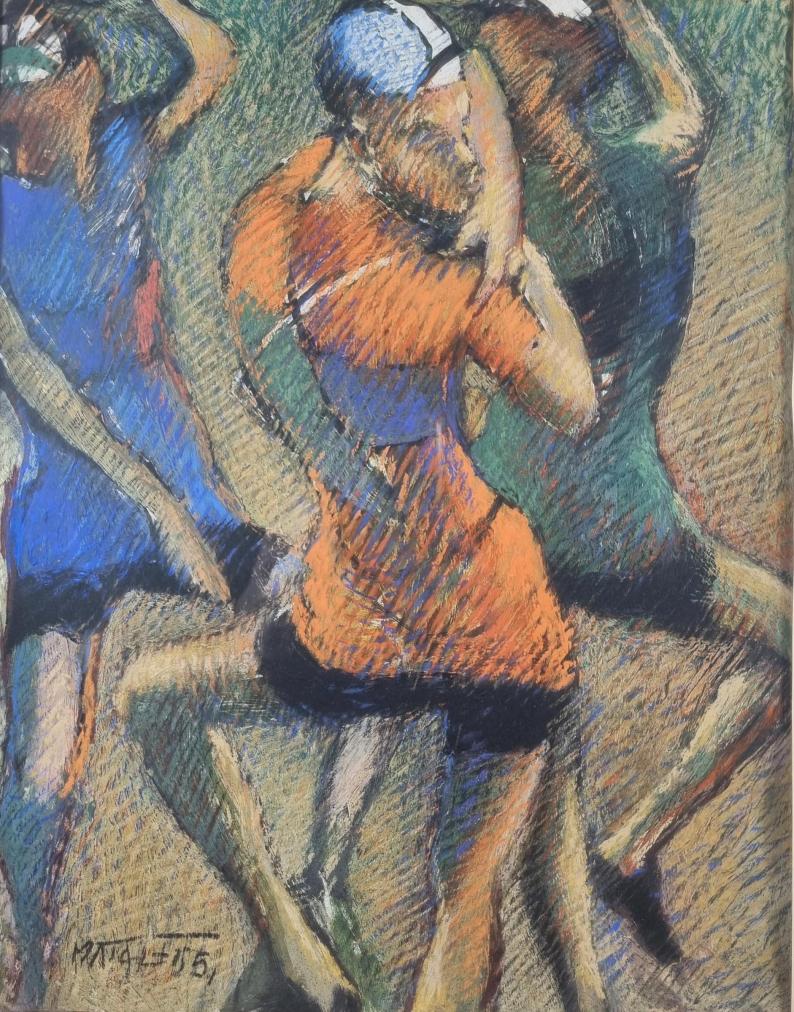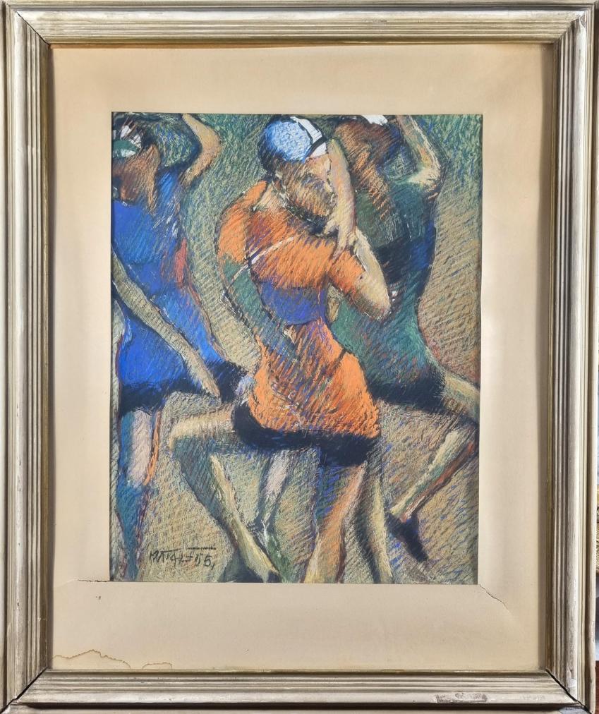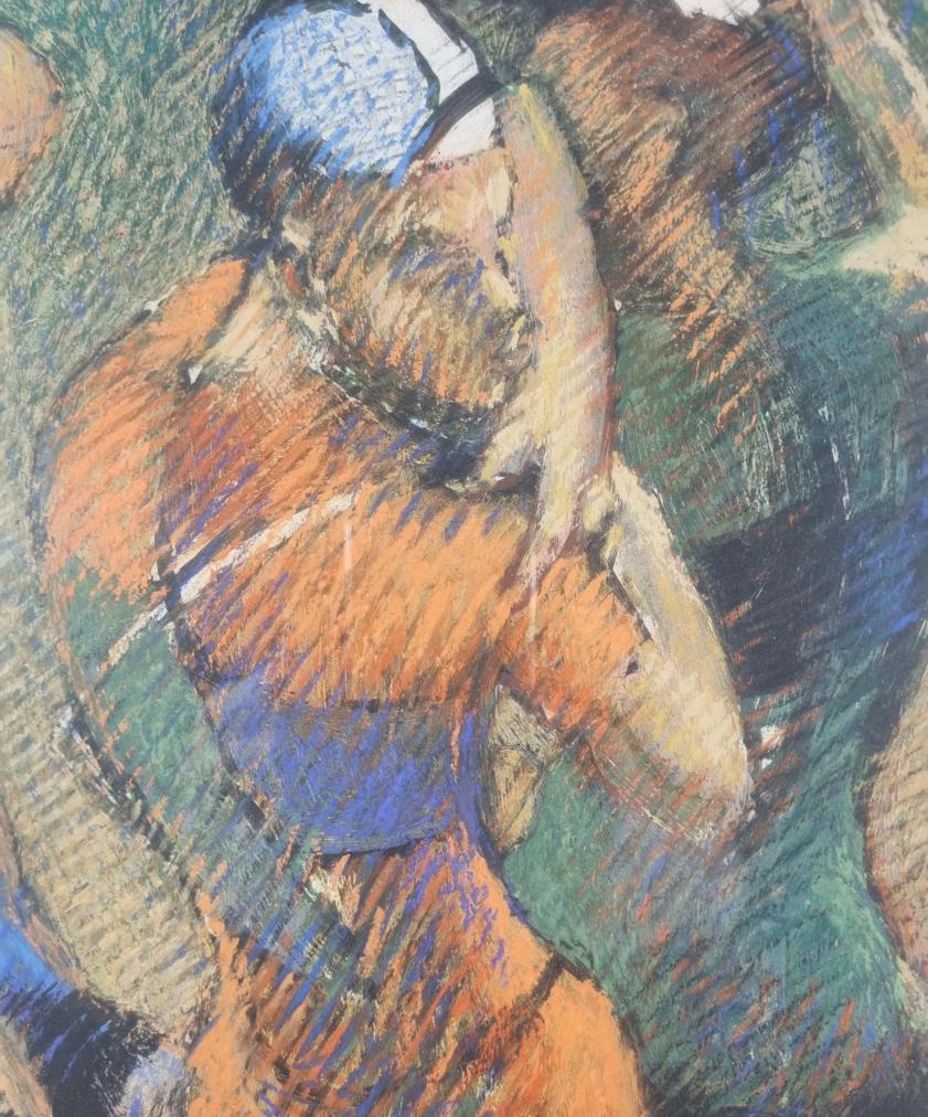 Krásná kresba od autora?. V díle vytváří autor trojici lidí, kteří stojí v různých pozicích těsně vedle sebe. Muži působí jako sportovci, mají jednotný oděv a na hlavě cyklistickou čepici. Kresbu autor vytváří za pomocí šikmých linek, které střídá na základě kontrastních barev. Kombinovaná technika na papíře, rámováno pod sklem, rozměry s rámem 62 x 51 cm, rozměry díla 40 x 32 cm. Signováno vlevo dole ???. Rám je lokálně poškozený, pasparta je v dolní části natržená a je na ni tmavší flek.
