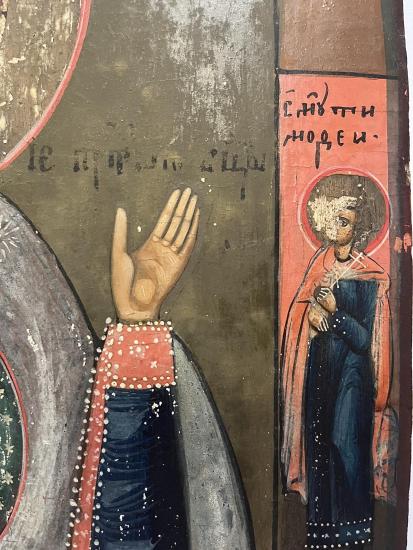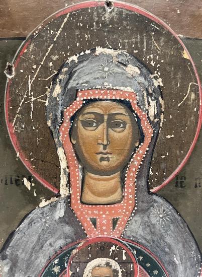 Pravoslavná ikona vyobrazující Matku Boží v pozici oranta se zobrazením Ježíše Krista v kruhu na její hrudi. V malbě se nachází několik škrábanců v oblasti hlavy Panny Marie, Ježíše a tváře postavy na pravé straně, viz foto. Rozměry 27 x 30 cm. Hloubka 5 cm.
