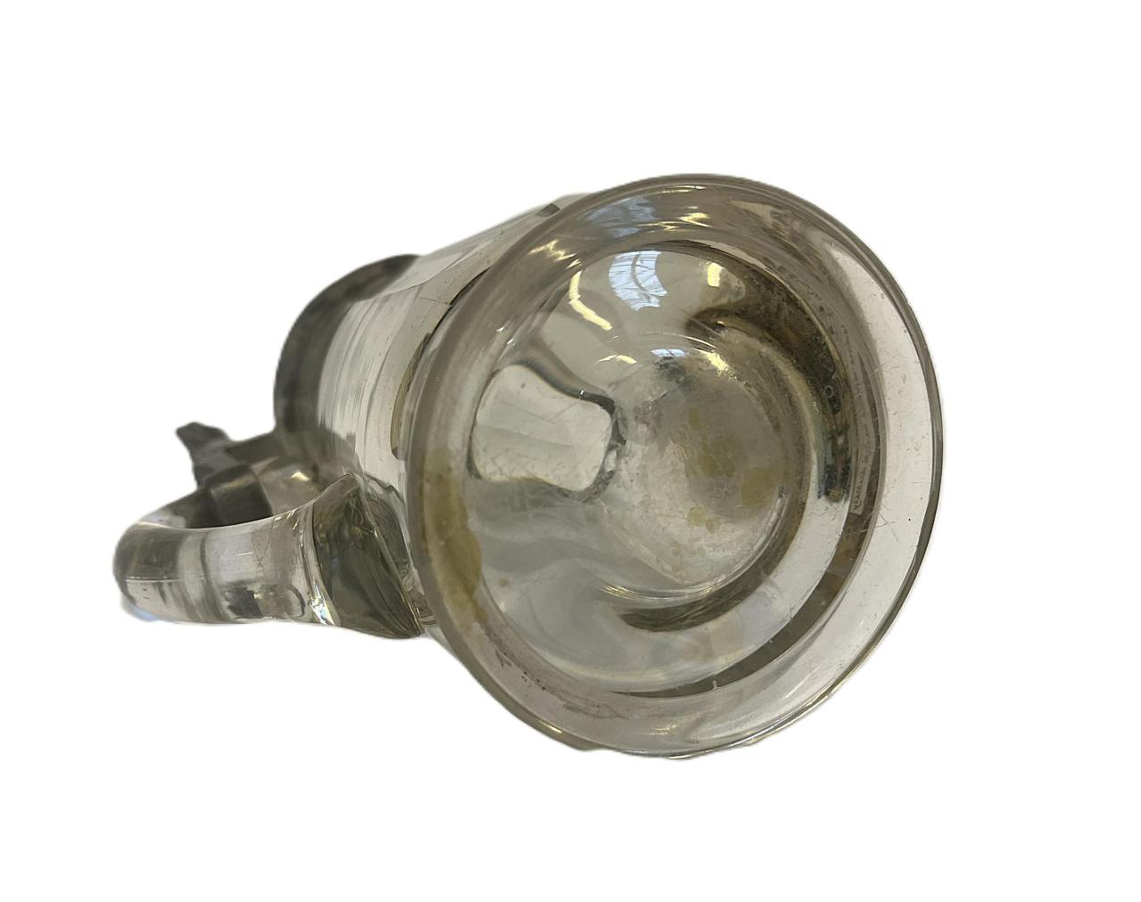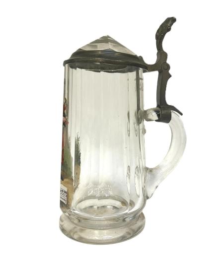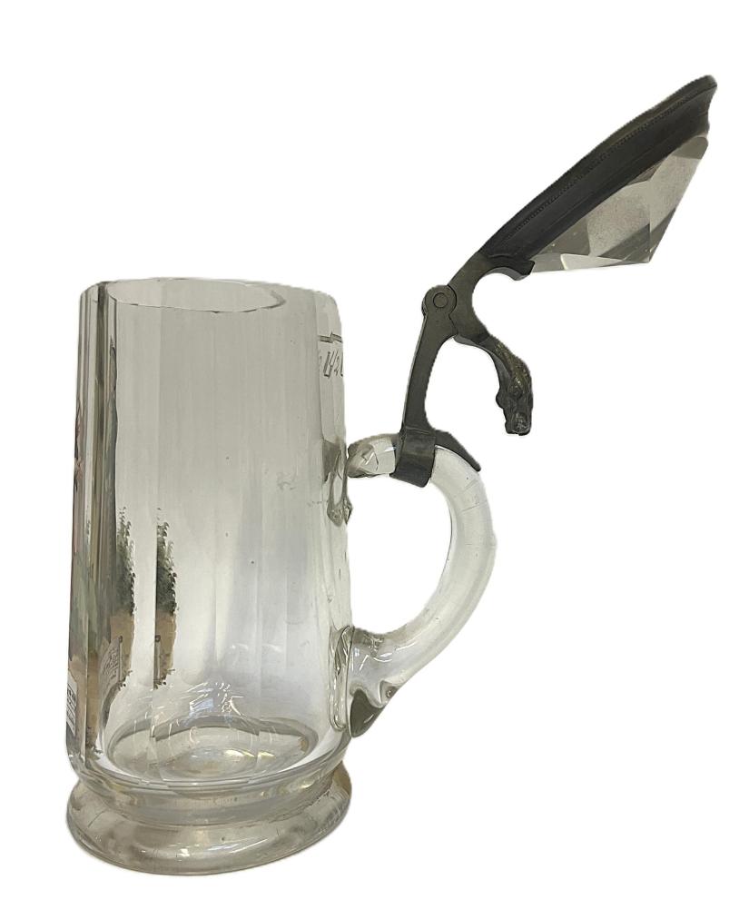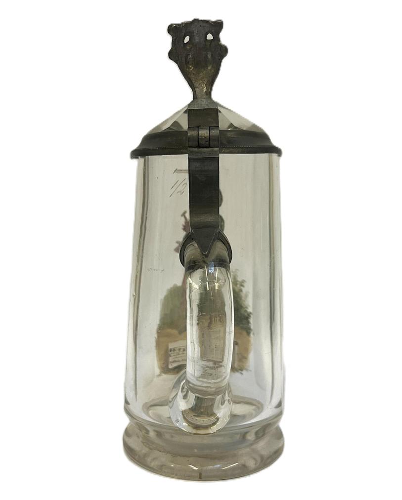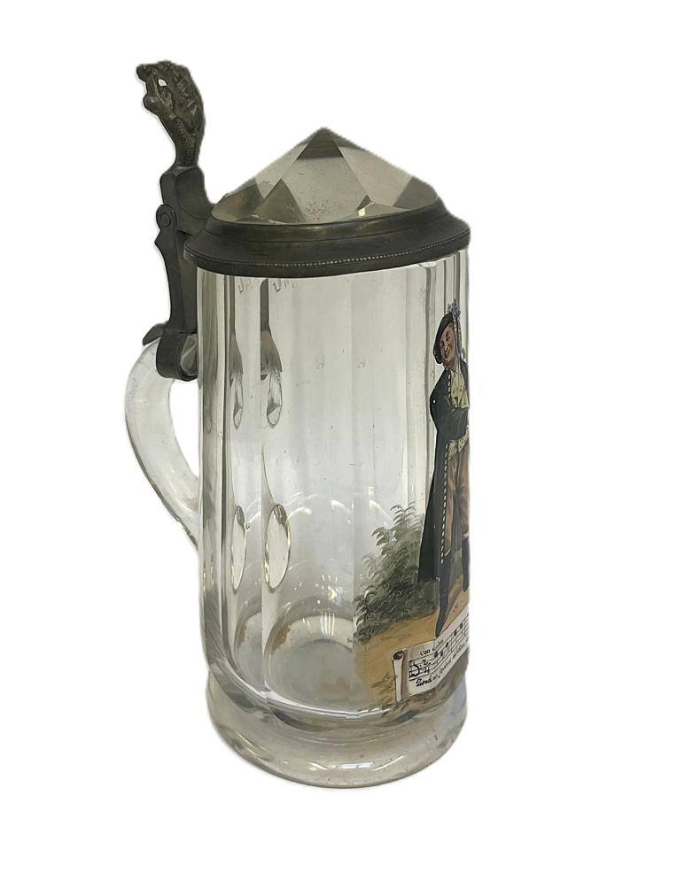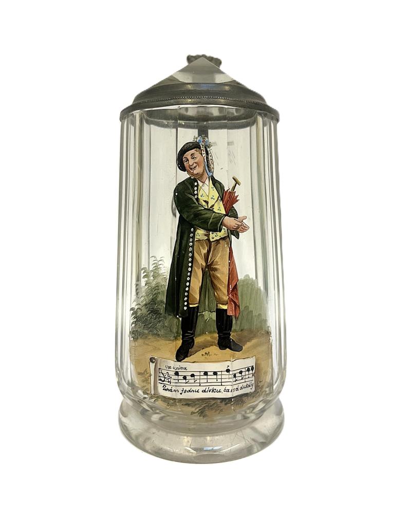 Starožitný krýgl s ruční malbou s námětem muže, který si právě popěvuje. Muž stojí v krajině a má radostný výraz, pod ním je fragment notového záznamu s útržkem písně. Malba je místy setřená. Celková výška 20 cm, průměr 7,5 cm, průměr podstavy 8,5 cm. Neznačeno. Bez oťuků.