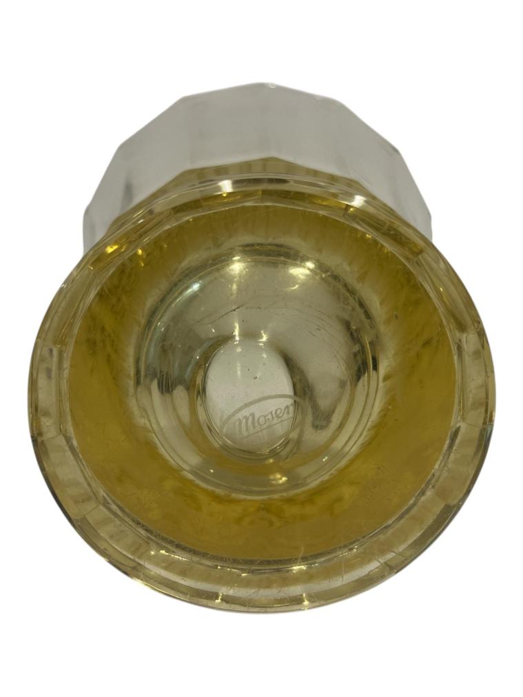 Půvabná citrínová váza značky Moser. Jednoduchý, čistý design je nadčasový a nestároucí. Výška 16,5 cm, průměr hrdla 15,5 cm, podstava 9 cm. Na váze jsou tu a tam velmi mělké rýhy, na podstavě větší množštví, jinak bez oťuků.