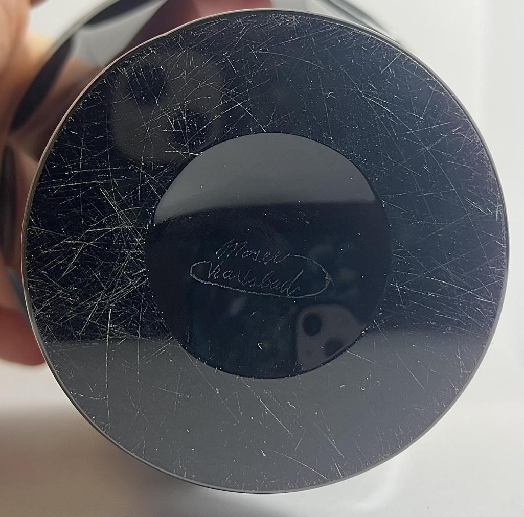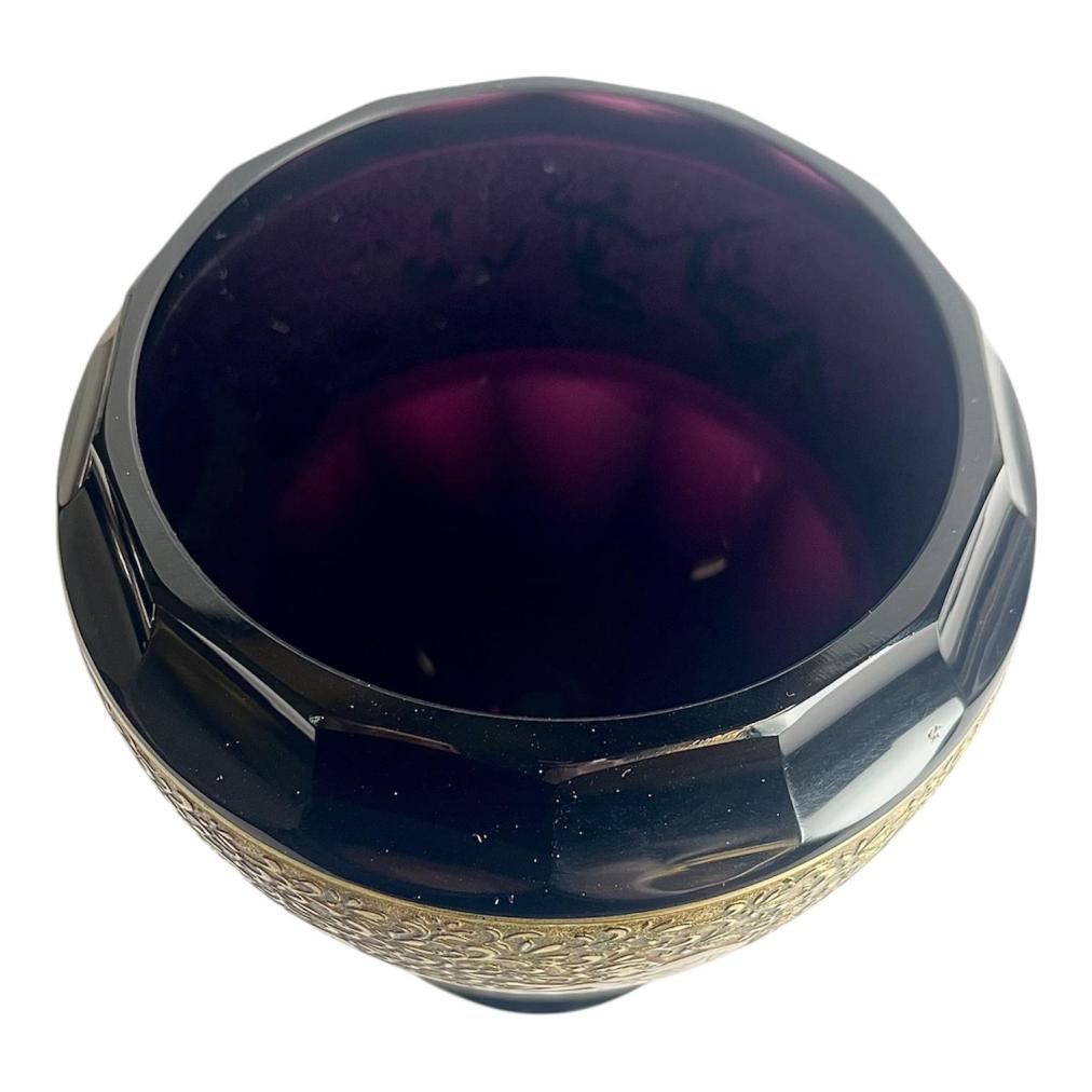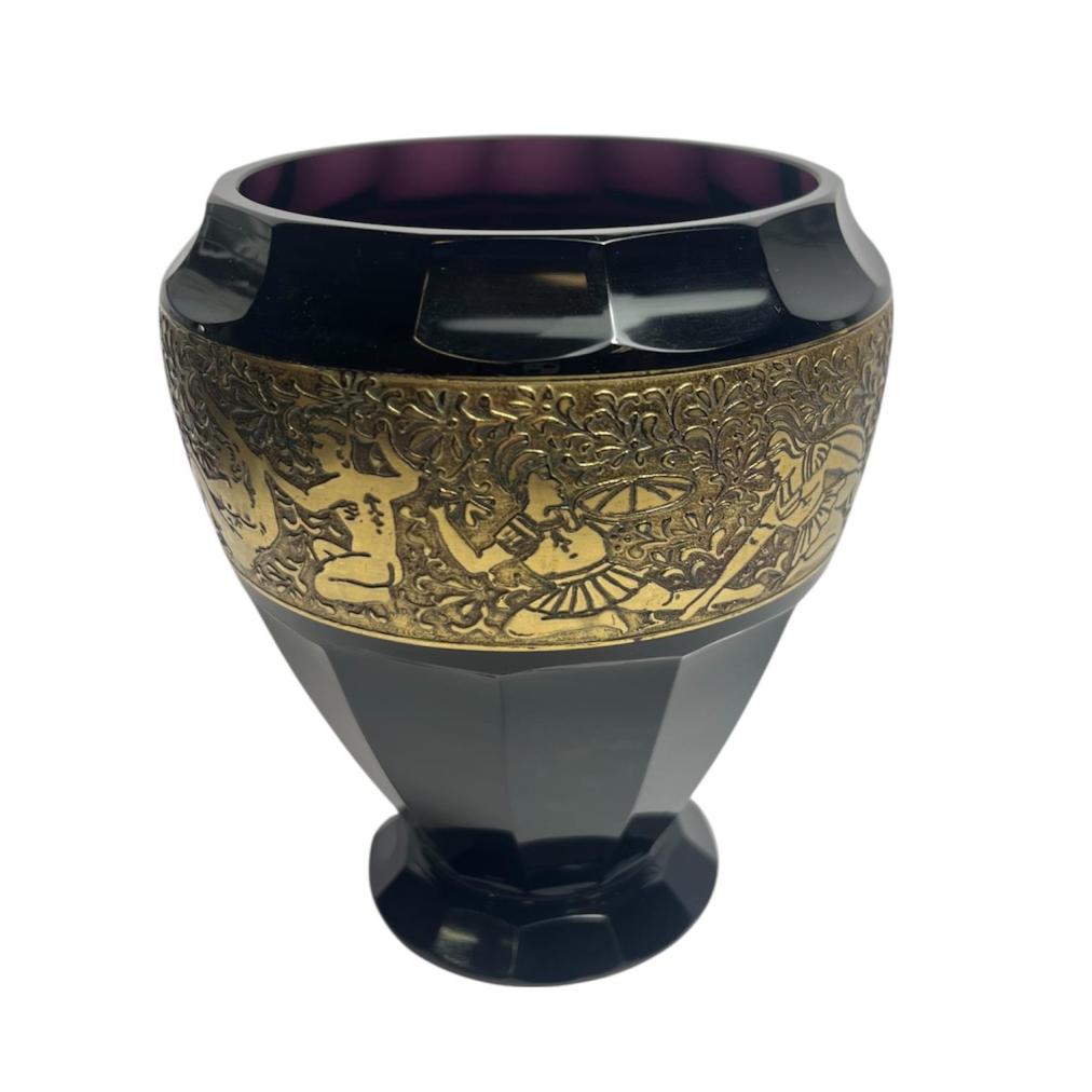 Krásná váza z ametystového skla od značky Moser, kterou zdobí oroplastika. Motivy na oroplastice zobrazují boj. Výška 14 cm, průměr hrdla 10 cm, podstava 7 cm. Značeno vespod - Moser. Váza má velmi drobné oťuky na broušených hrankách a jeden malý oťuk nad pásem oroplastiky. Na podstavě mělké rýhy, viz foto.