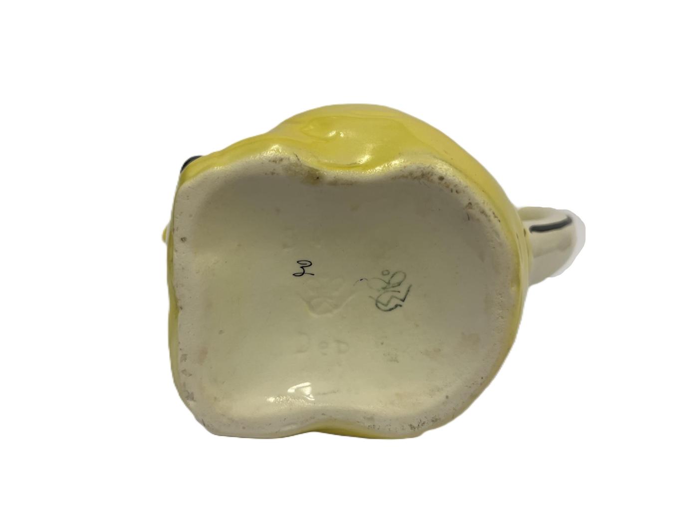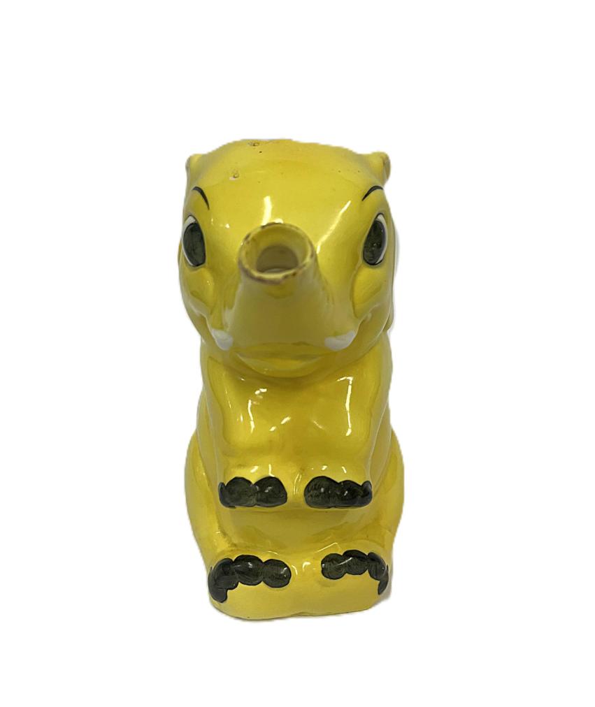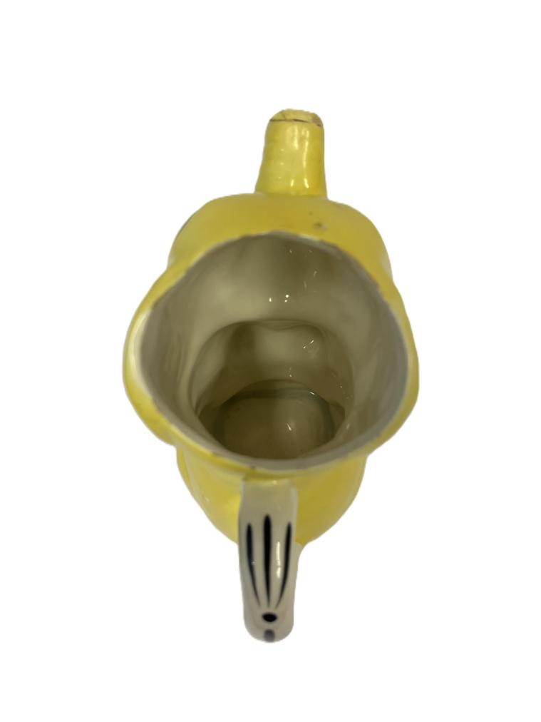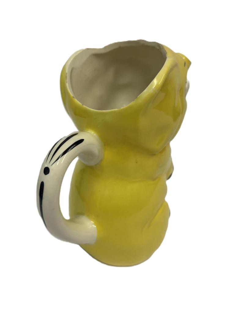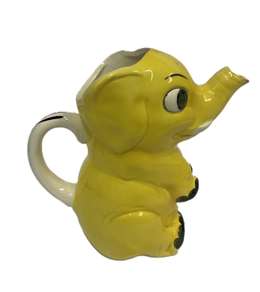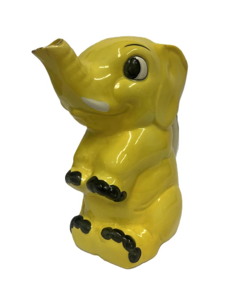 Roztomilá nádoba z porcelánu v podobě žlutého slona, jehož nos je zároveň nálevkou. Značka Oeslau, Německo. Design je čistý, žlutou barvu doplňují černé plochy a linky, na uchu je folklórní dekor. Výška 17 cm, v nejširším bodě 17 cm, podstava 8 x 7 cm. Značeno vespod - viz foto. Žlutá plocha má několik oťuků, dva výraznější a tři menší, chobot po hranách též oťuky a jemné praskliny uvnitř, otvor po celé hraně několik uťuků, viz foto.